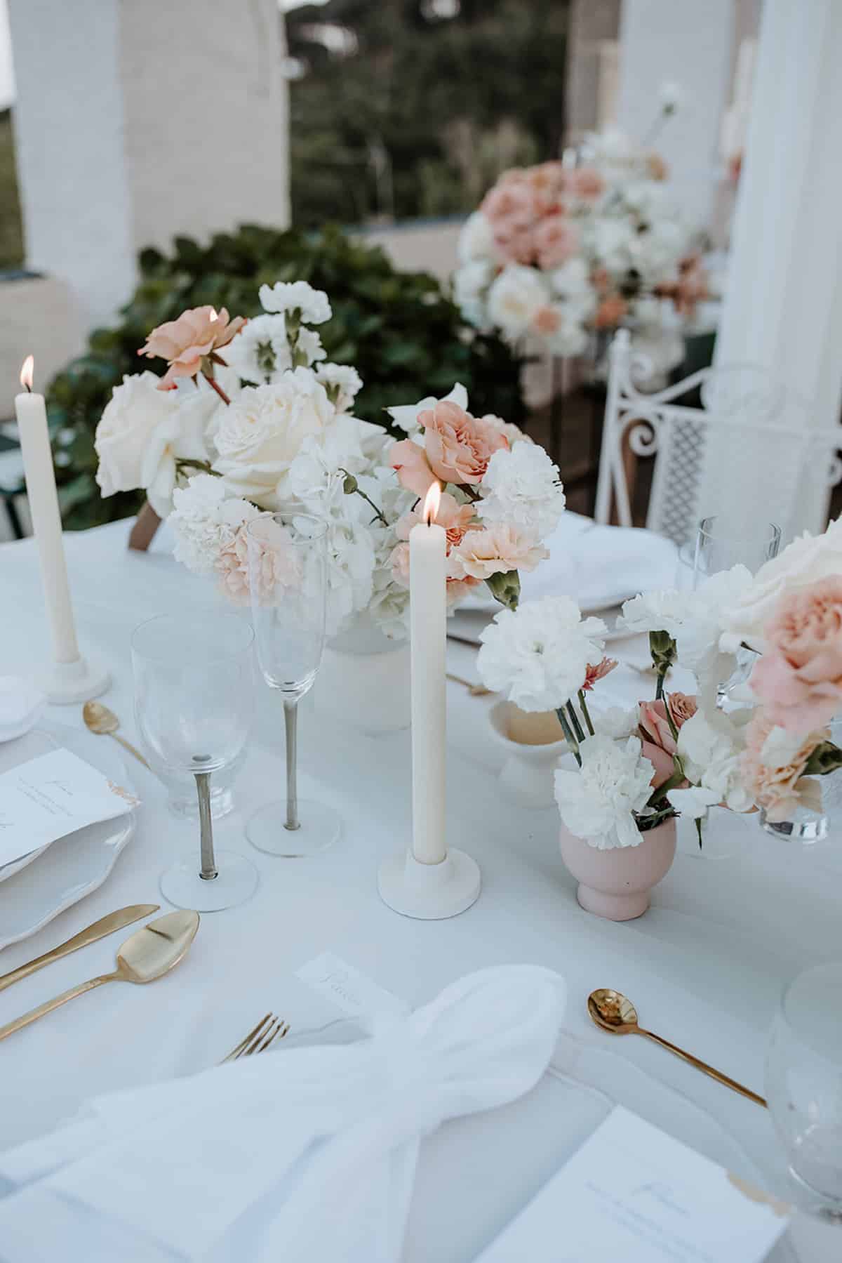 Al igual que la gran mesa decorada con maravillosos centros de rosas, claveles y hortensias de la mano de Amflors , quienes también realizaron el ramo de la novia.