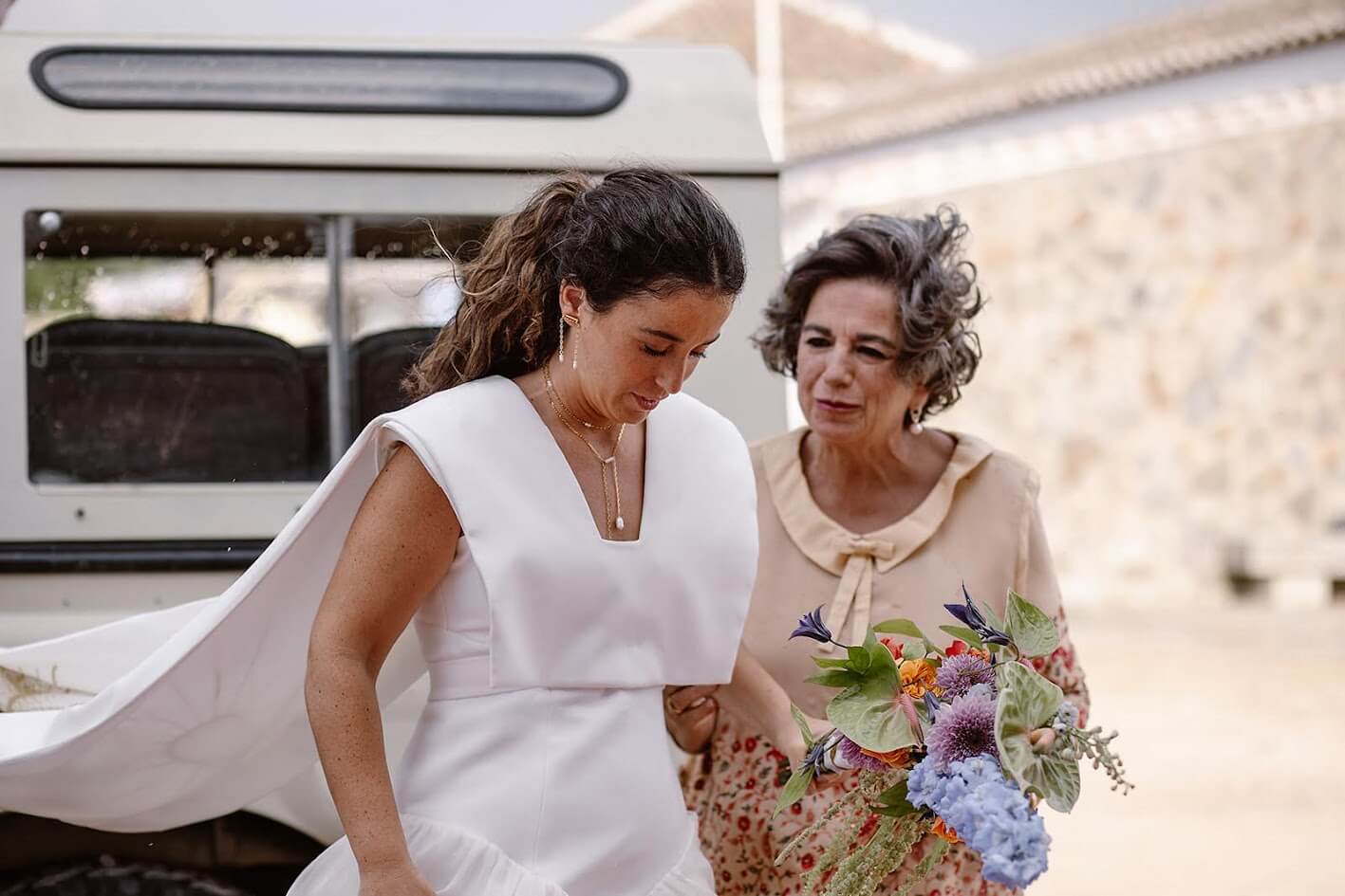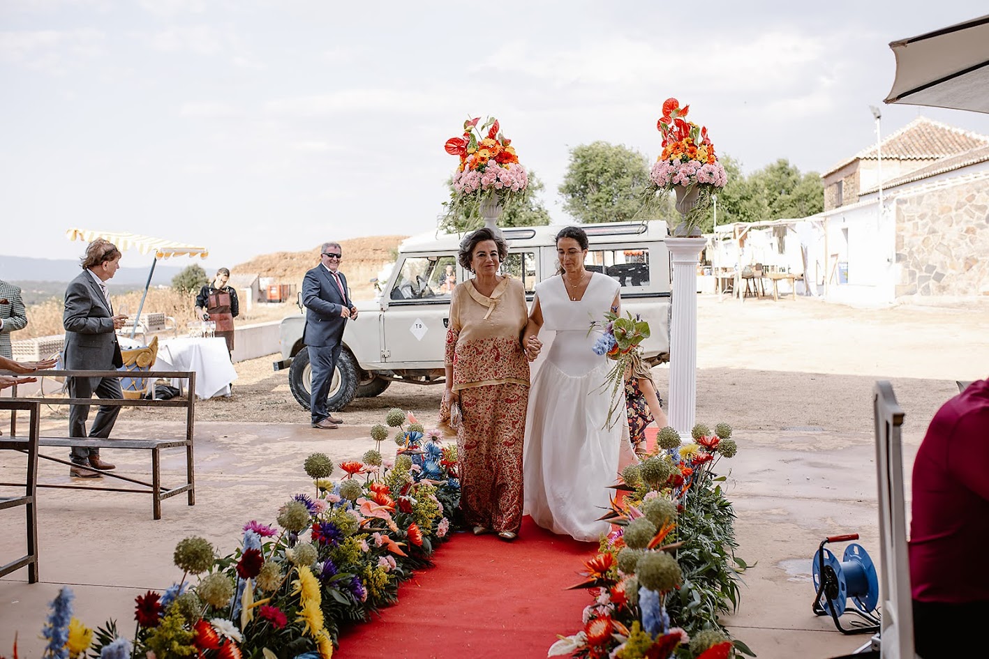 Querían una boda que inspirara vida, color y alegría, y así fue. Para llegar a la finca, los testigos lo hicieron en los tradicionales carros del Milagro, los mismos que decoraron su madre y su tía en la última romería.
