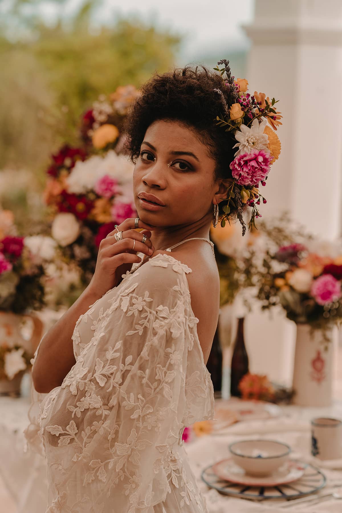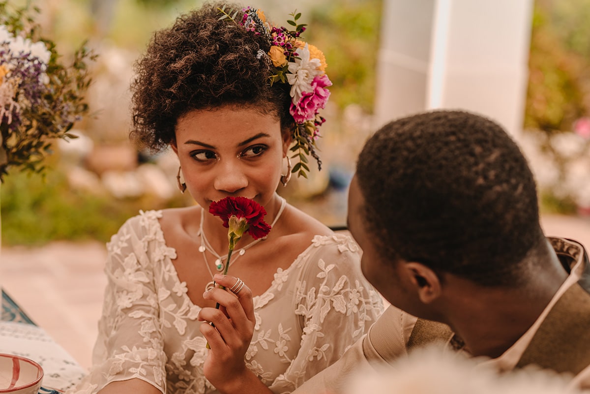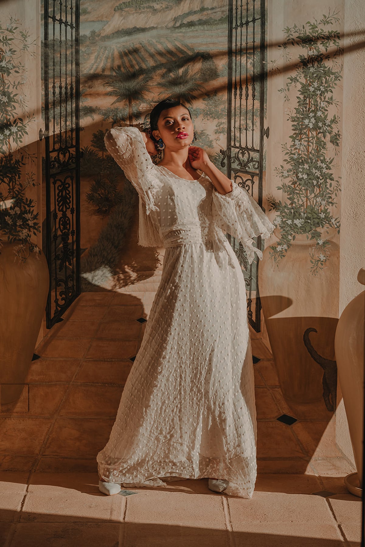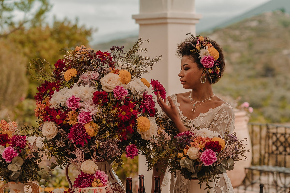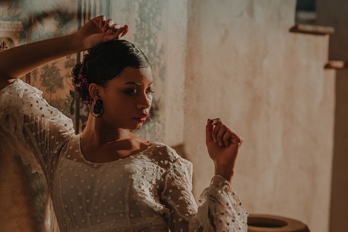 La etnia de nuestros protagonistas se mezcla con cada ápice granadino. Una editorial inspirada en la viveza de la cultura granadina, presente en cada flor, en cada elemento de su cerámica, en cada rama de su valle. Un fondo perfecto que arropa cualquier cultura sin importar su procedencia.