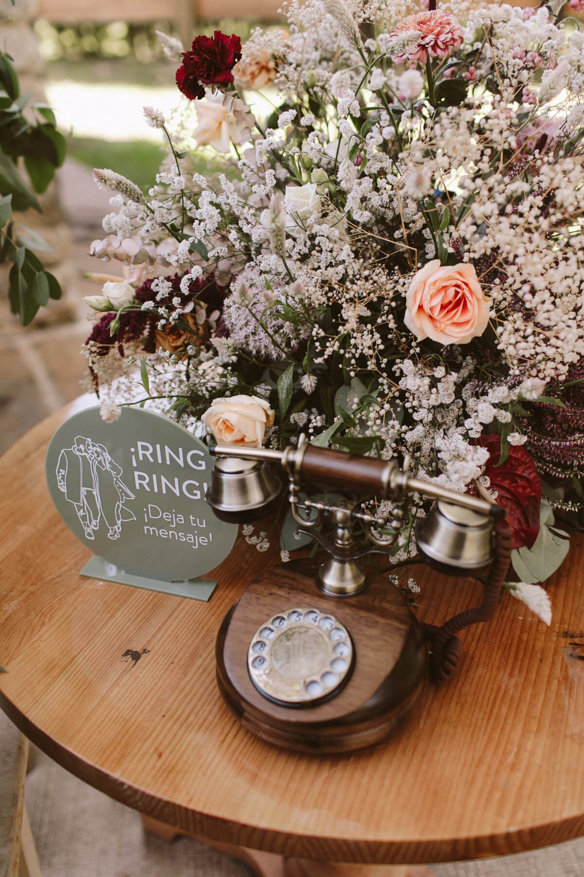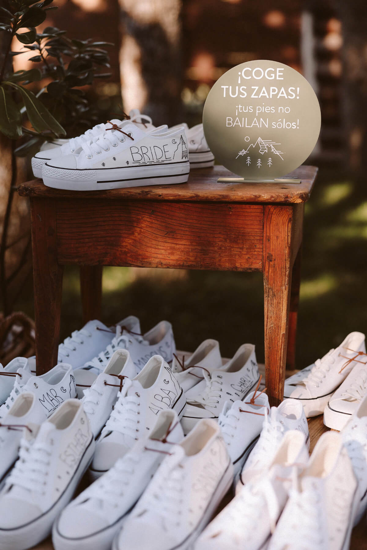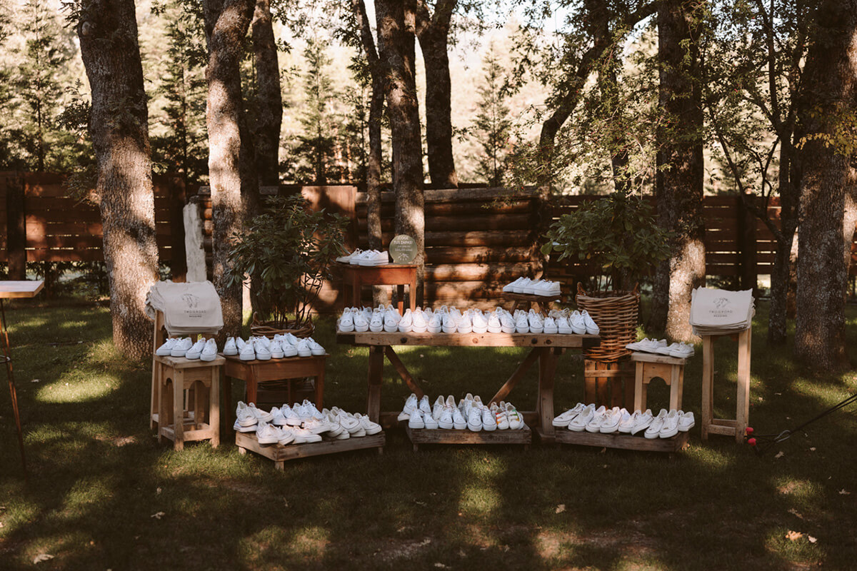 El ambiente del cóctel fue muy discernido, en plena naturaleza, acompañado con música en pinchada en vinilo. El diseño cuidado de la cartelería, un seating plan inspirado en una galería de arte, y las minutas impresas en carretes analógicos sorprendieron a los invitados. Decidimos regalar a los invitados unas zapatillas personalizadas, pintadas a mano por @valgemelli. Otra de las sorpresas que se encontró nuestros invitados fue un teléfono antiguo dónde podían dejar un mensaje para nosotros.