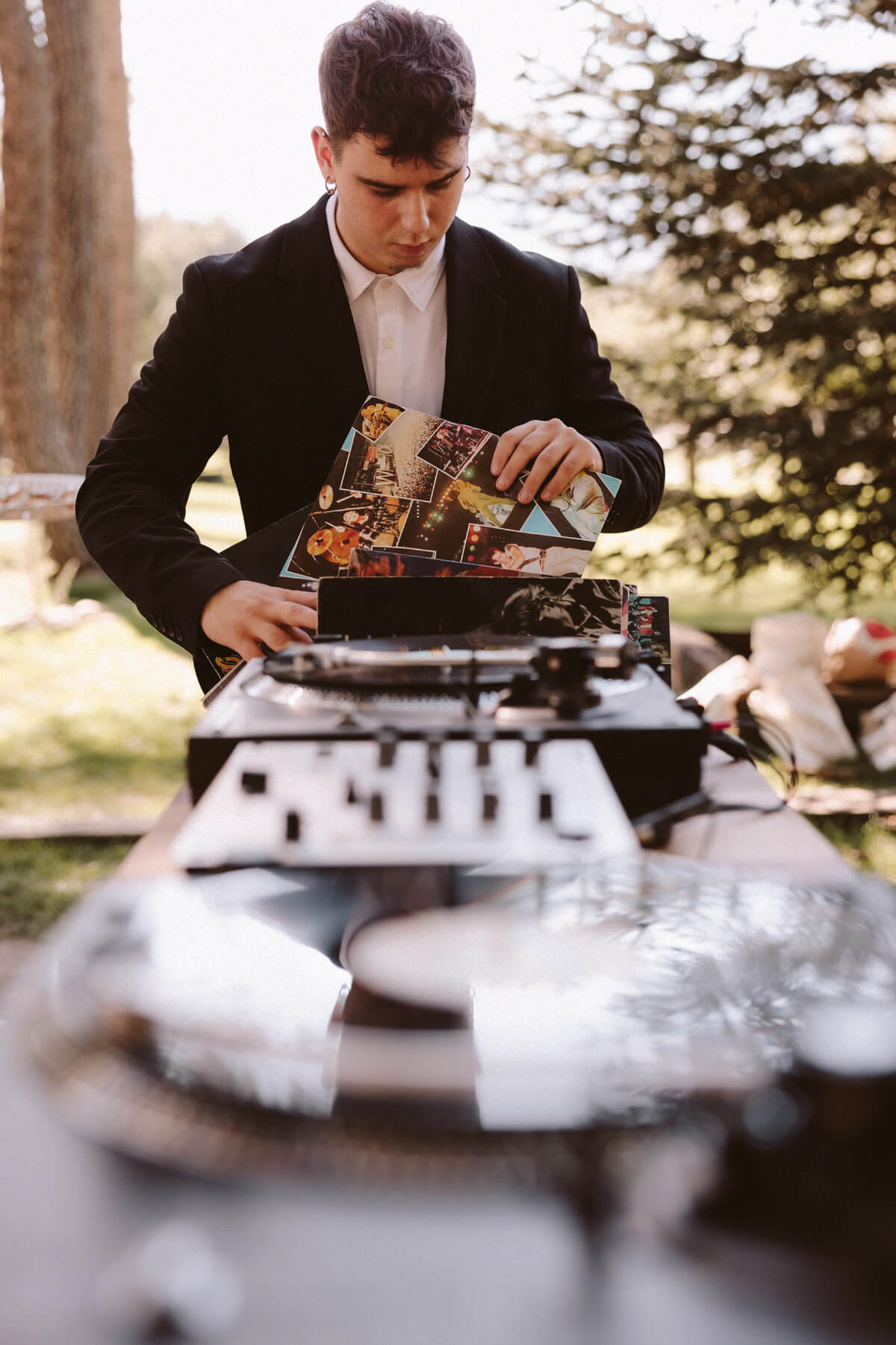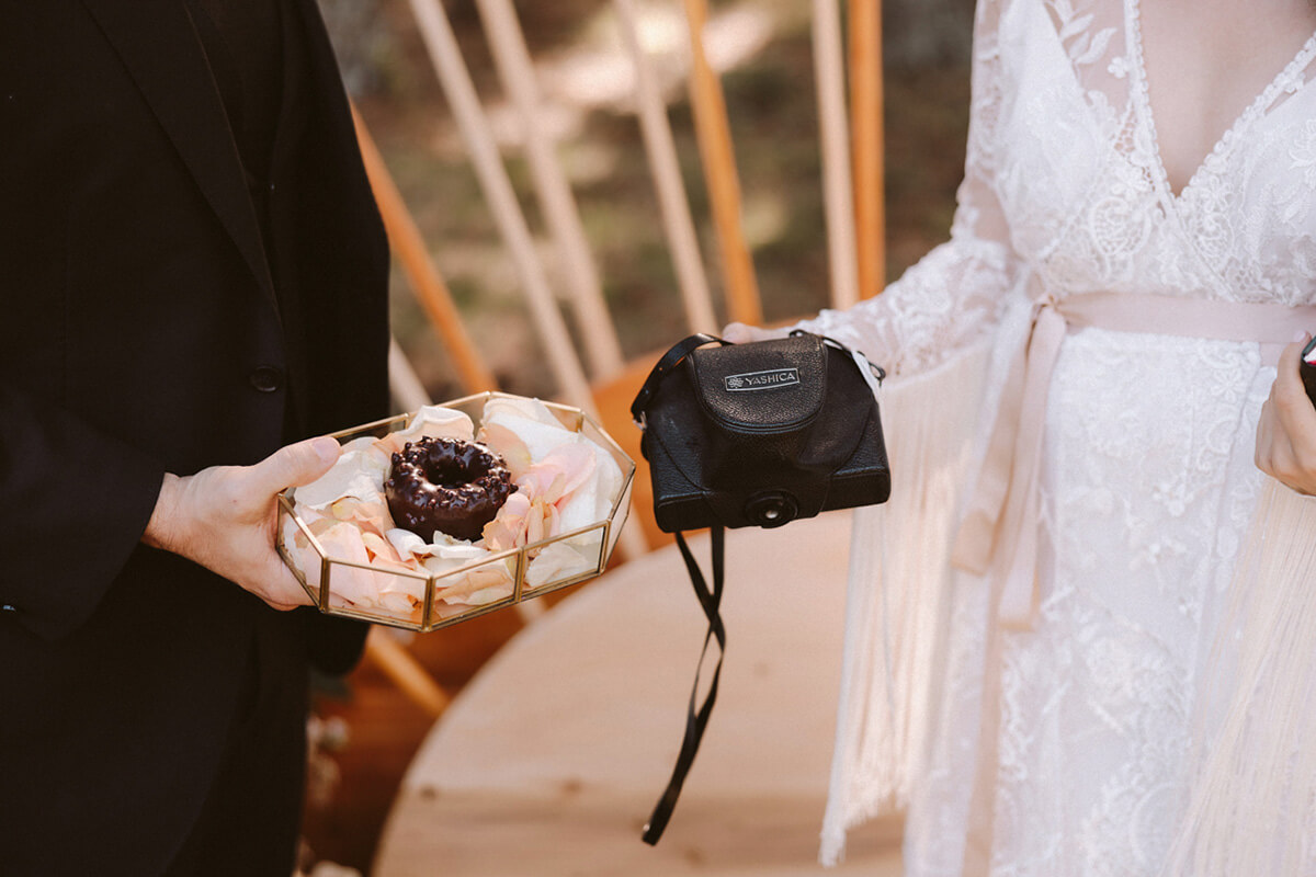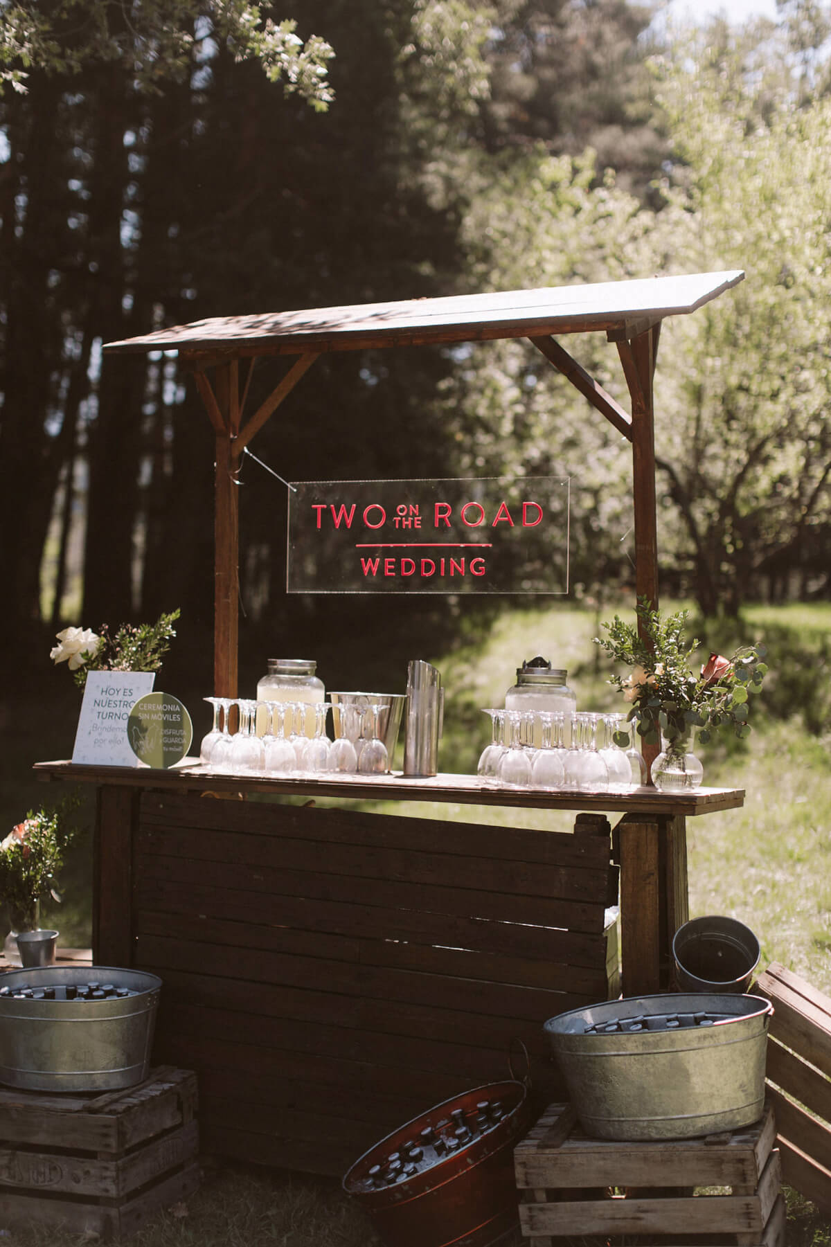El ambiente del cóctel fue muy discernido, en plena naturaleza, acompañado con música en pinchada en vinilo. El diseño cuidado de la cartelería, un seating plan inspirado en una galería de arte, y las minutas impresas en carretes analógicos sorprendieron a los invitados. Decidimos regalar a los invitados unas zapatillas personalizadas, pintadas a mano por @valgemelli. Otra de las sorpresas que se encontró nuestros invitados fue un teléfono antiguo dónde podían dejar un mensaje para nosotros.