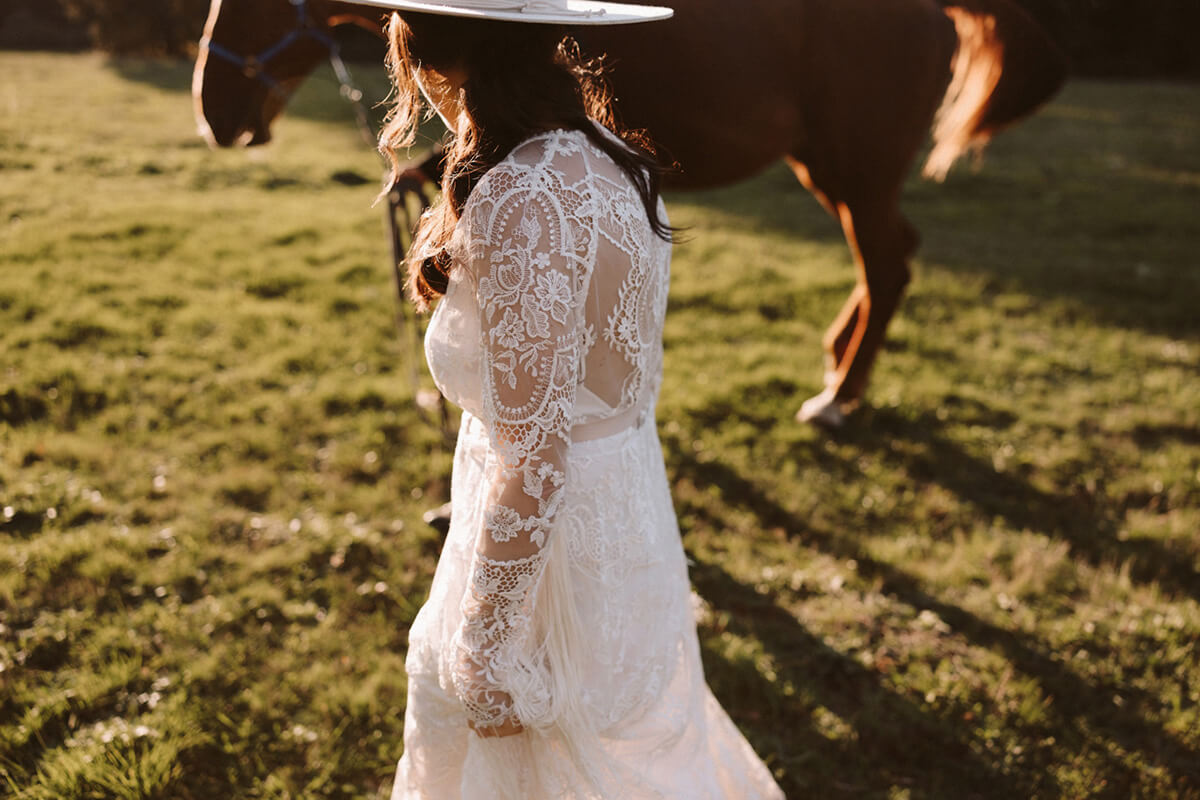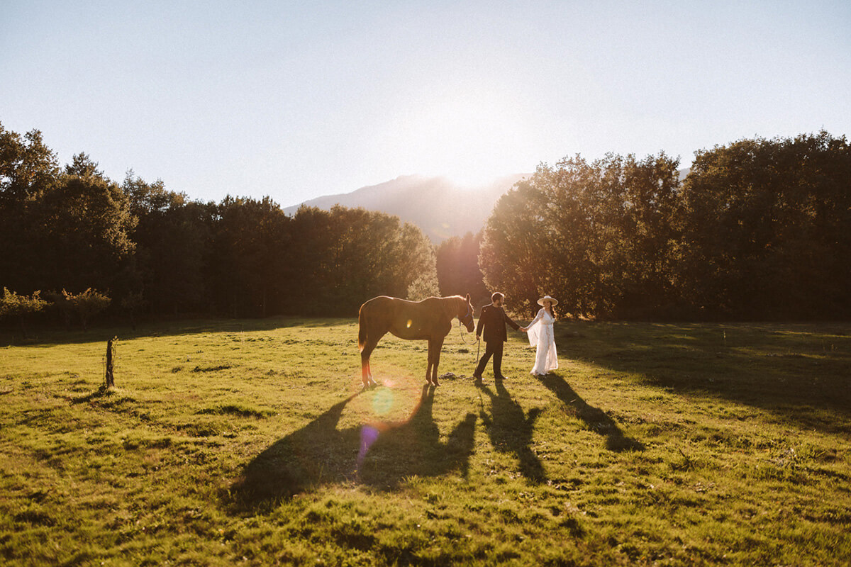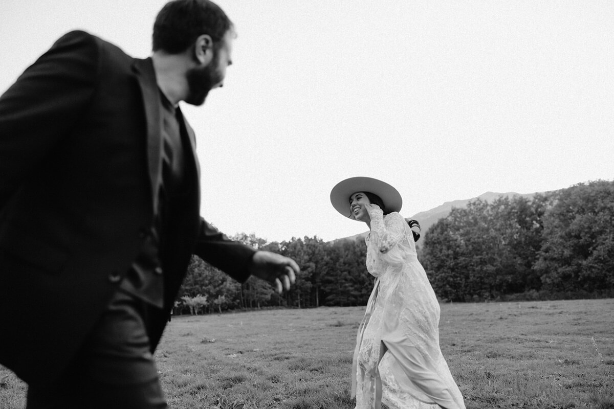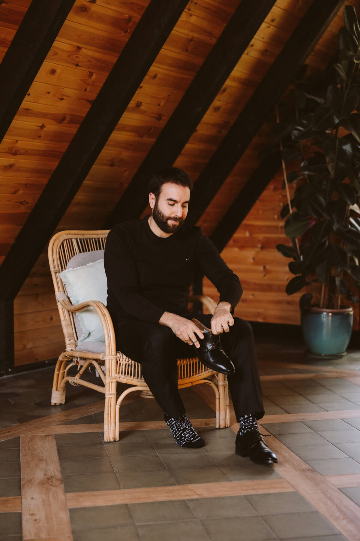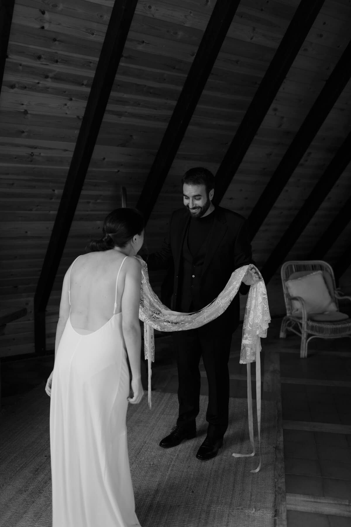 El día de la boda comenzó con una elección muy nosotros que fue vestirnos juntos y que nos aportó un momento tranquilo, íntimo y especial. Del estilismo de Lorena se encargó Paula Guzmán, del vestido Immaclé y los complementos venían de la mano: las botas de Immaclé, el sombrero Raceu hats y las gafas de Prada. Sergio eligió un traje de Hugo Boss y apostó por un look total Black.