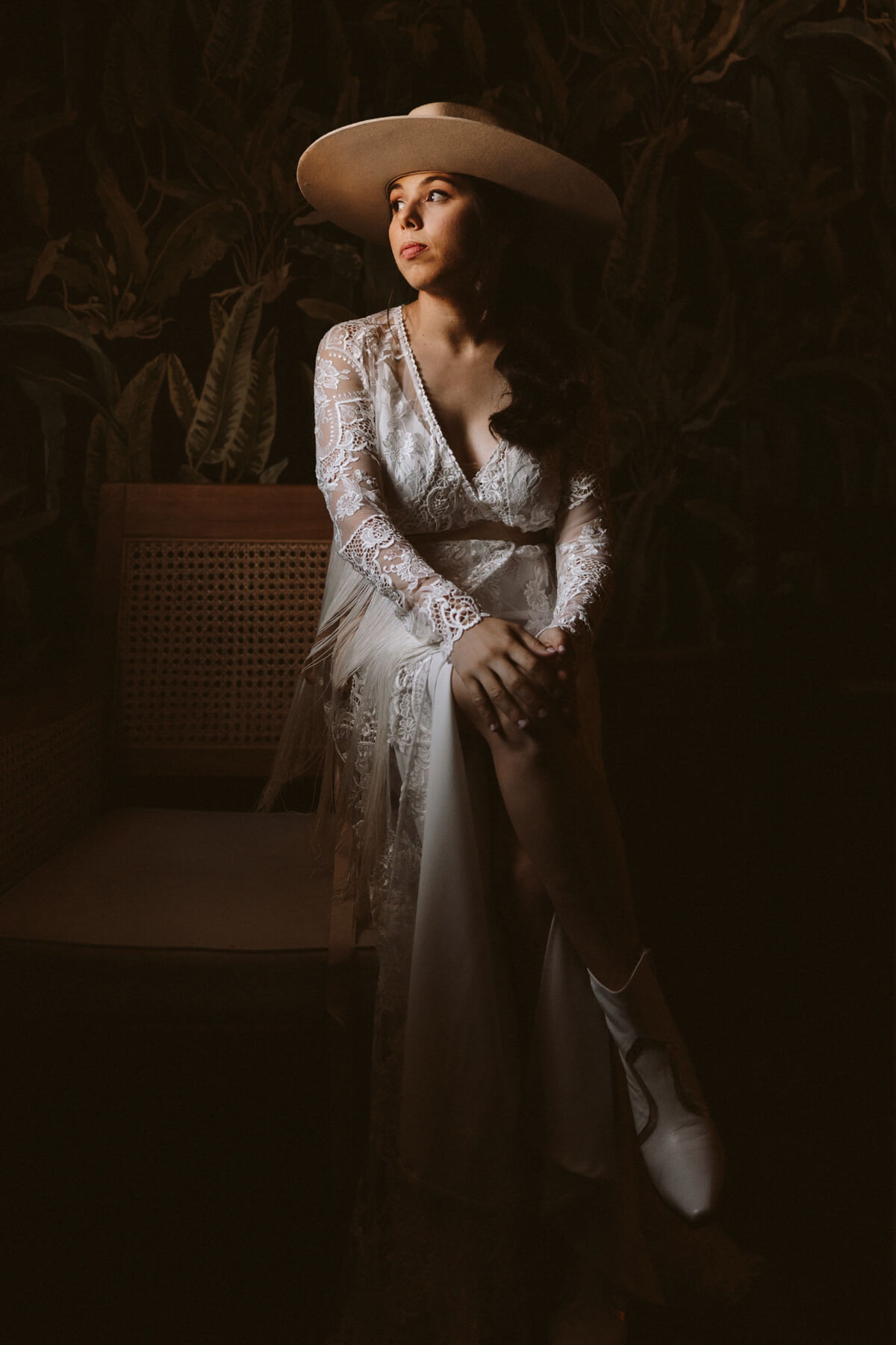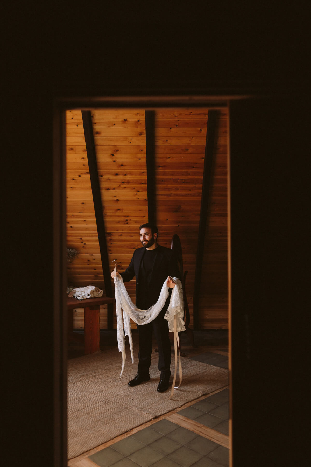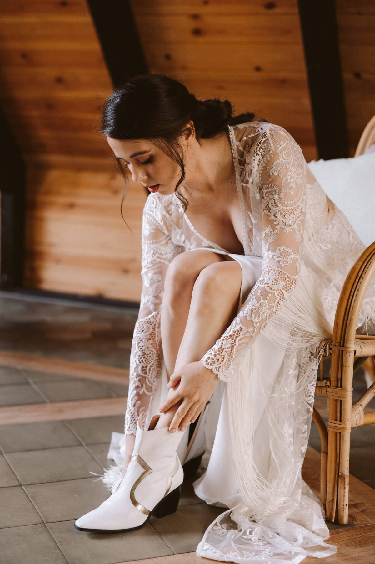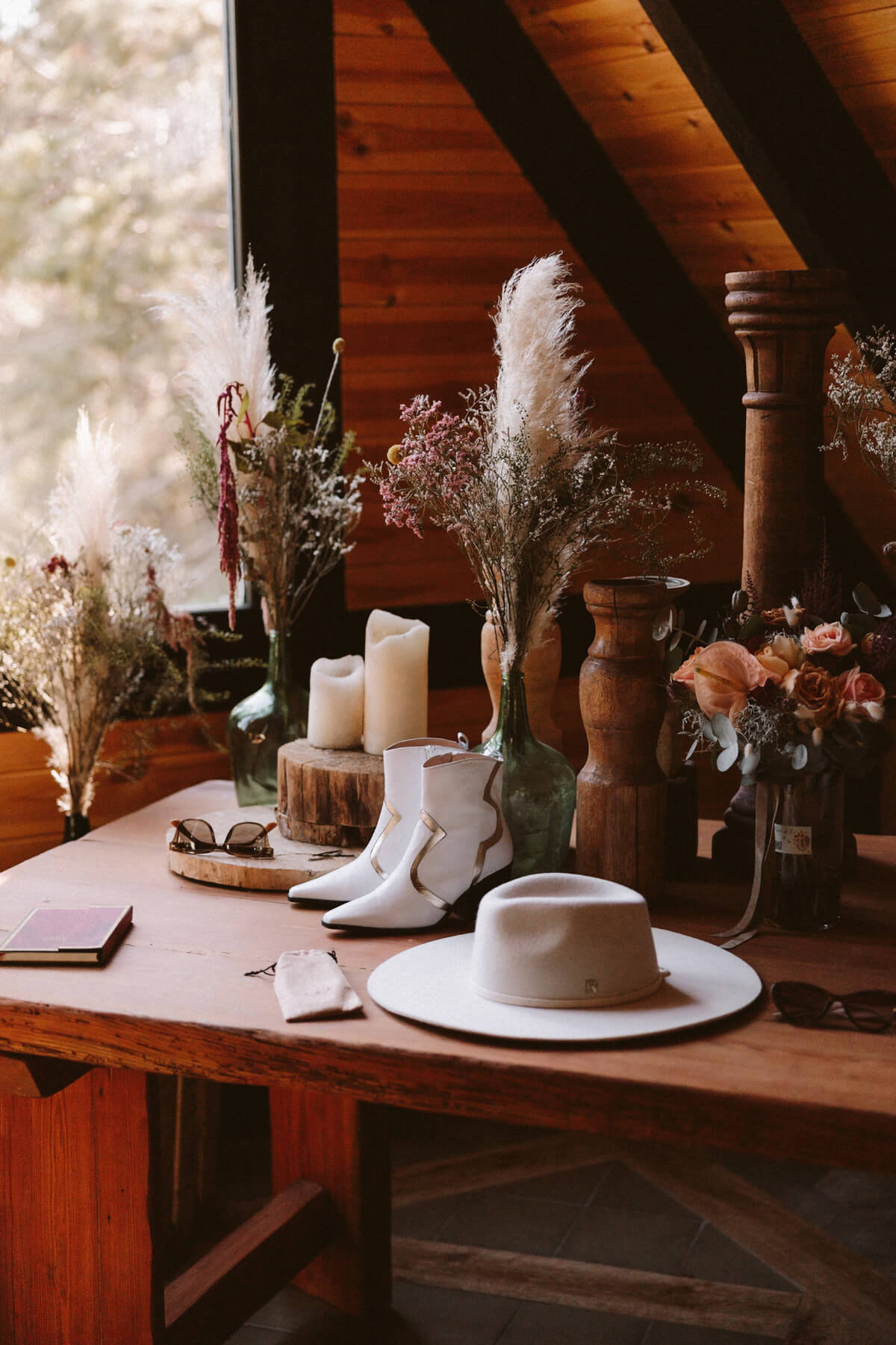 El día de la boda comenzó con una elección muy nosotros que fue vestirnos juntos y que nos aportó un momento tranquilo, íntimo y especial. Del estilismo de Lorena se encargó Paula Guzmán, del vestido Immaclé y los complementos venían de la mano: las botas de Immaclé, el sombrero Raceu hats y las gafas de Prada. Sergio eligió un traje de Hugo Boss y apostó por un look total Black.