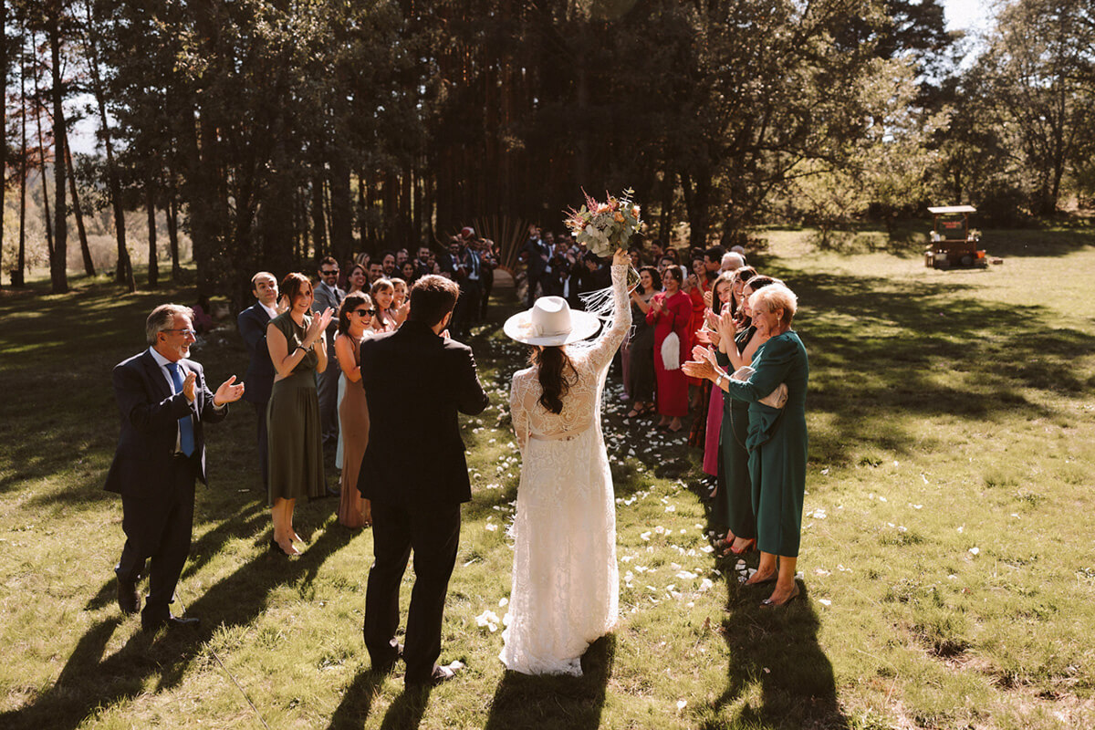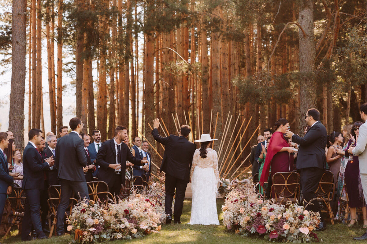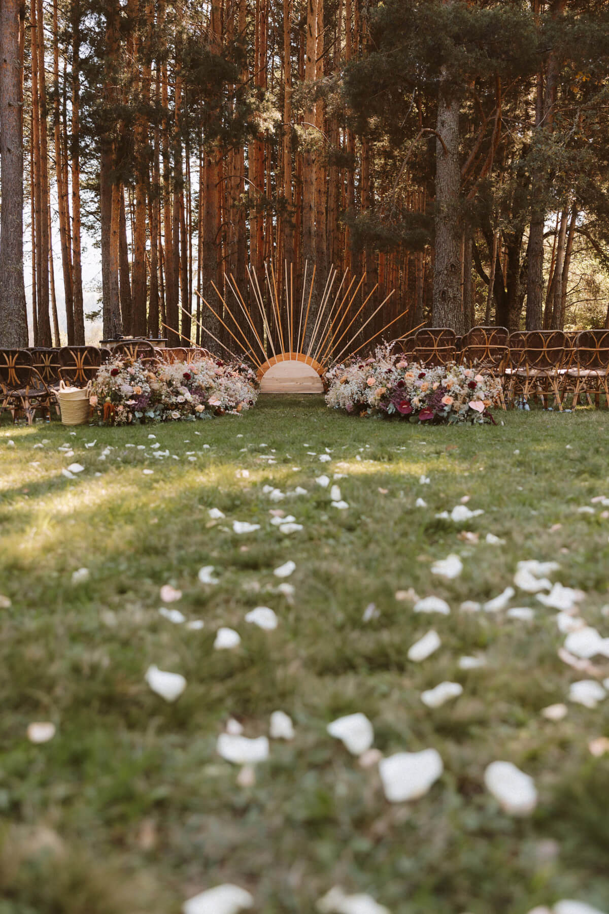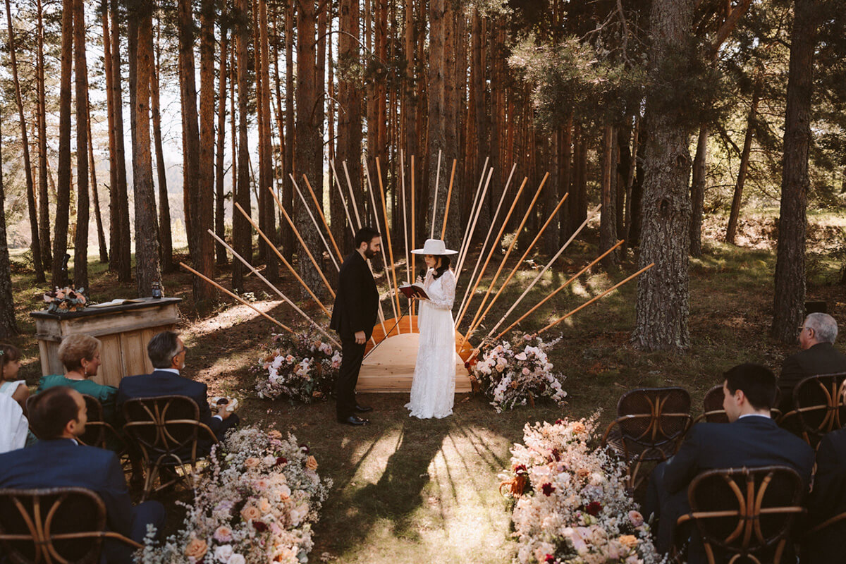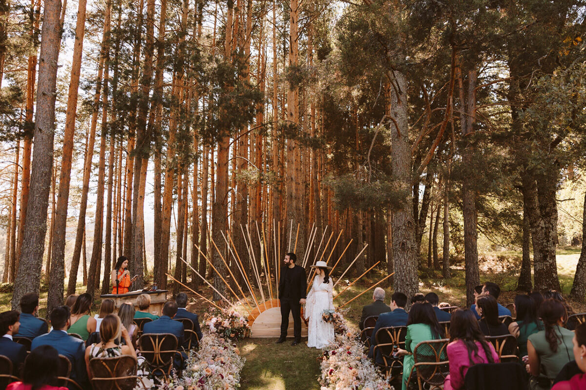 Elegimos todos los espacios de manera minuciosa guiándonos por la luz y el tema principal de la ceremonia, no podía ser otro que fue un sol en mitad del bosque al que llegamos por un camino de flores y del que se encargó Flors de vici bajo la coordinación de Lorena de tremendo lío.