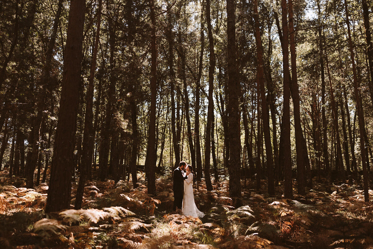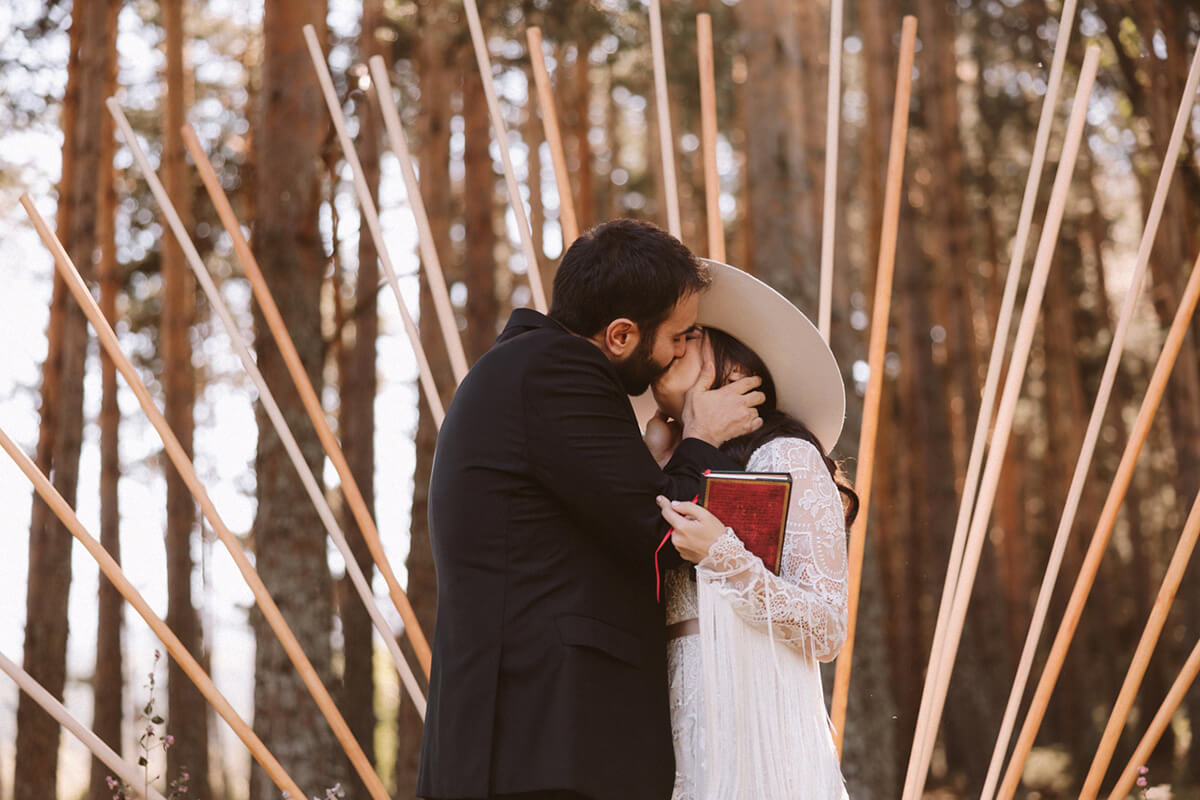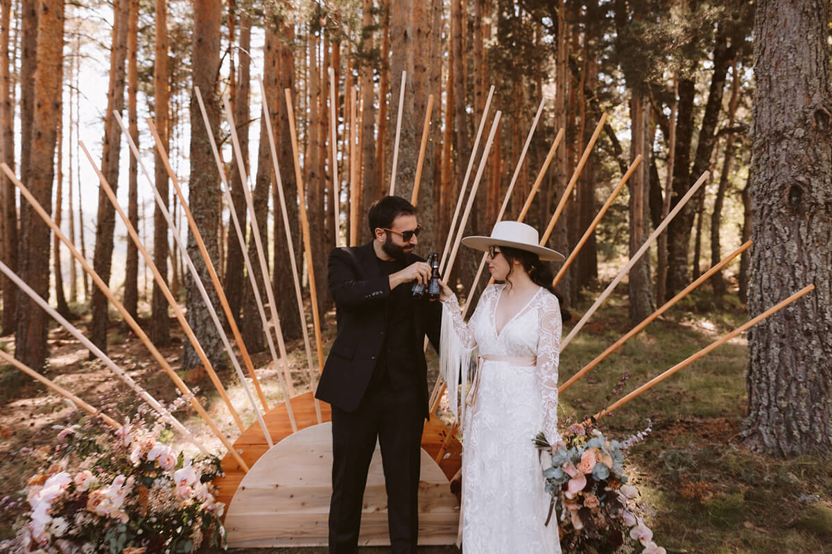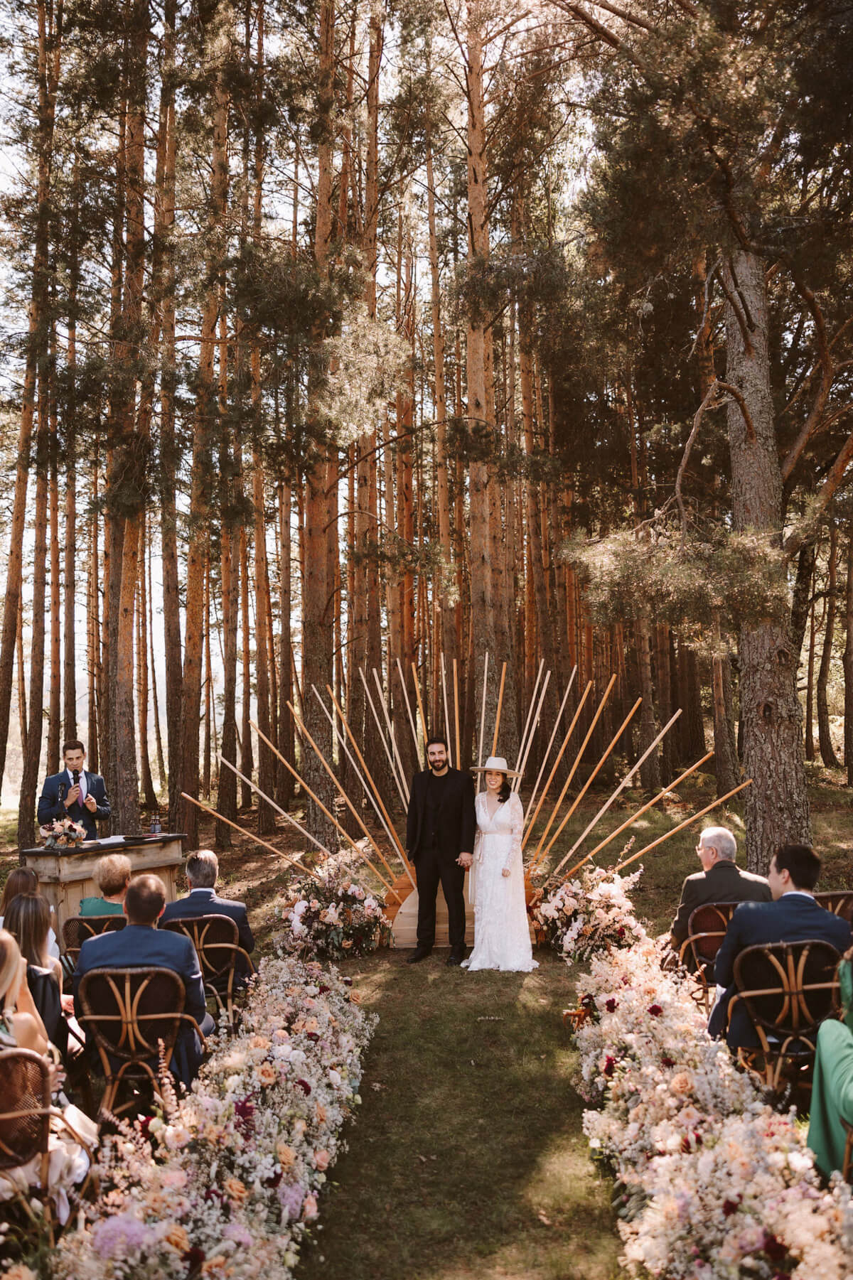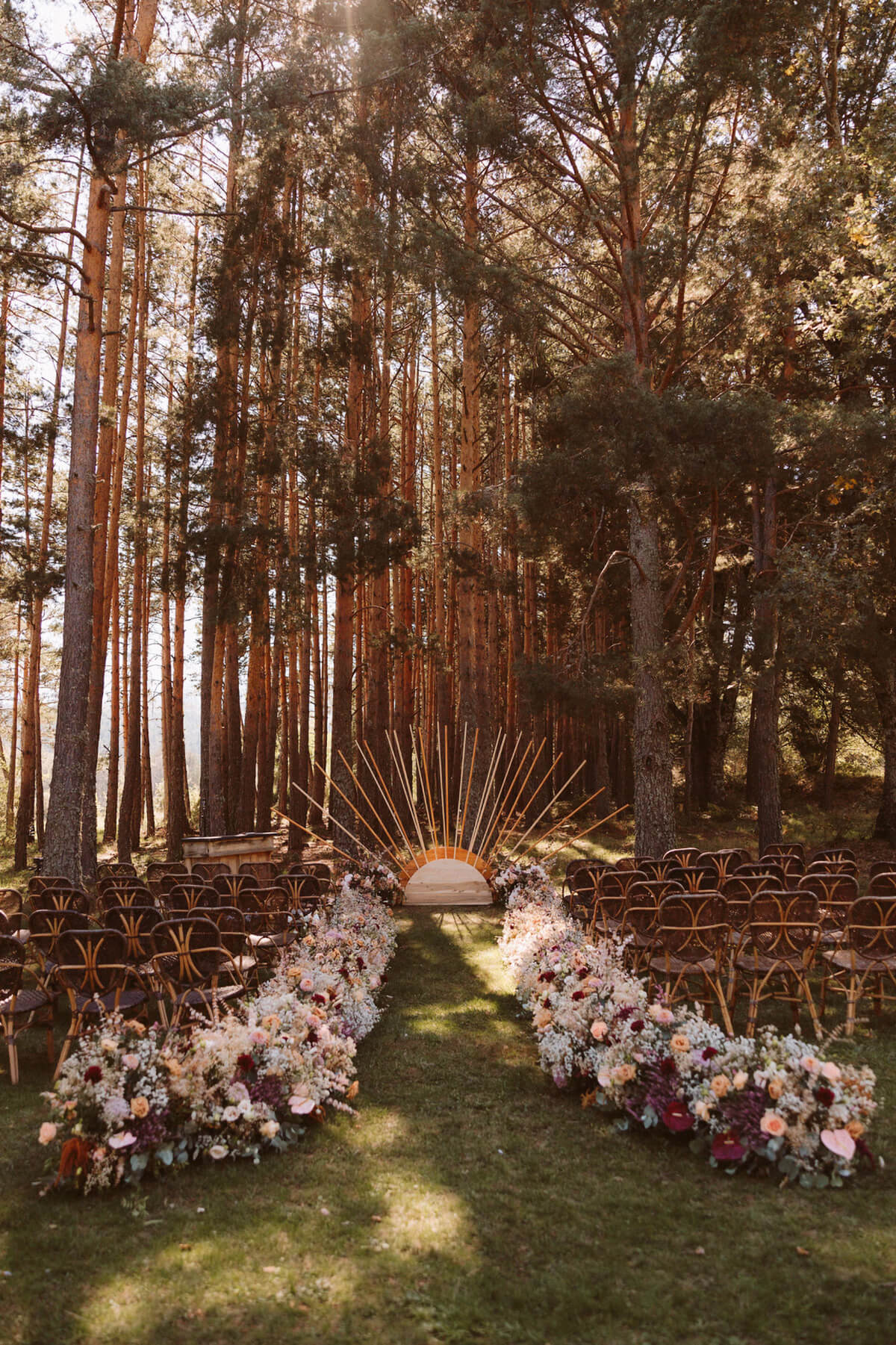 Elegimos todos los espacios de manera minuciosa guiándonos por la luz y el tema principal de la ceremonia, no podía ser otro que fue un sol en mitad del bosque al que llegamos por un camino de flores y del que se encargó Flors de vici bajo la coordinación de Lorena de tremendo lío.