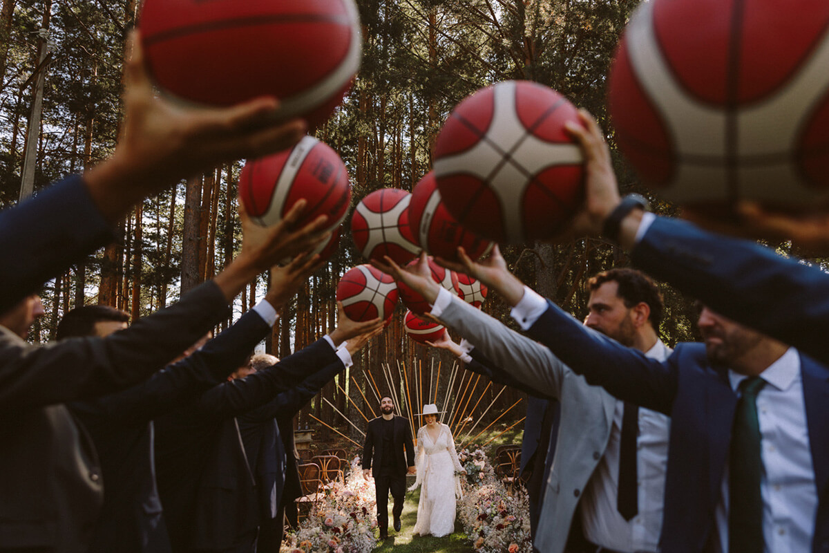 El año y medio de preparación fue muy guay. Tuvimos muchas charlas con Lorena de Tremendo lío y nos ayudó a juntar al dream team soñado. Teníamos claro que dos temas estarían muy presentes en la boda, la fotografía y el baloncesto. Dos conceptos difícil de mezclar pero que viendo el resultado quedó una boda brutal.