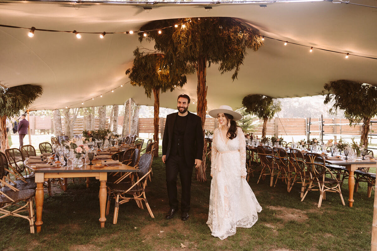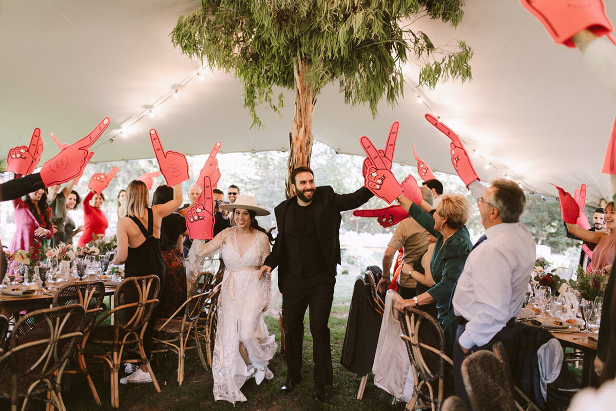 La cena sucedió bajo una carpa decorada con árboles que nos transportó a un bosque mágico. Y queriendo evitar el momento servilleta voladora, personalizamos con nuestro logo “Twoontheroad wedding” dedos gigantes para que toda nuestra “afición” nos diera la bienvenida.