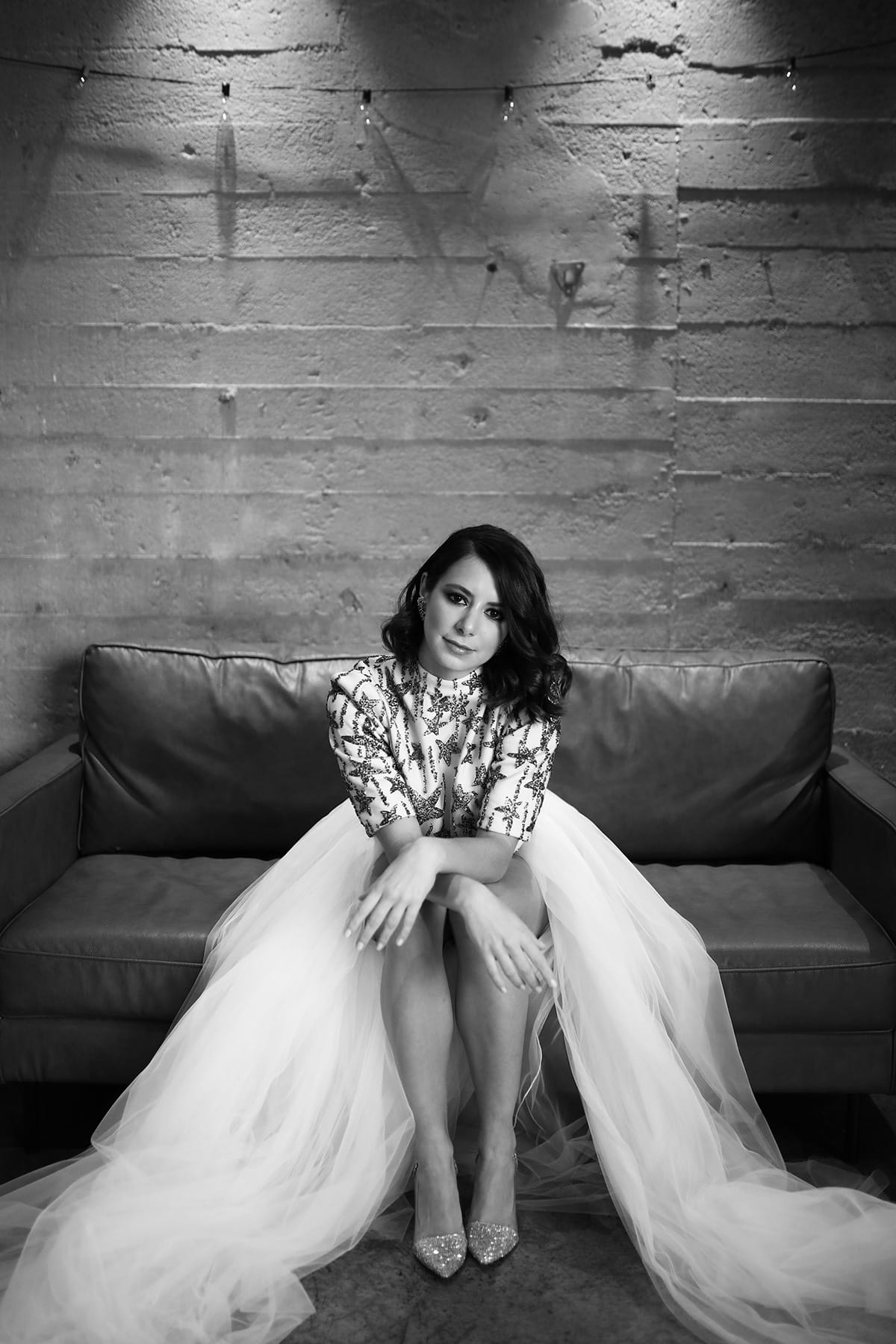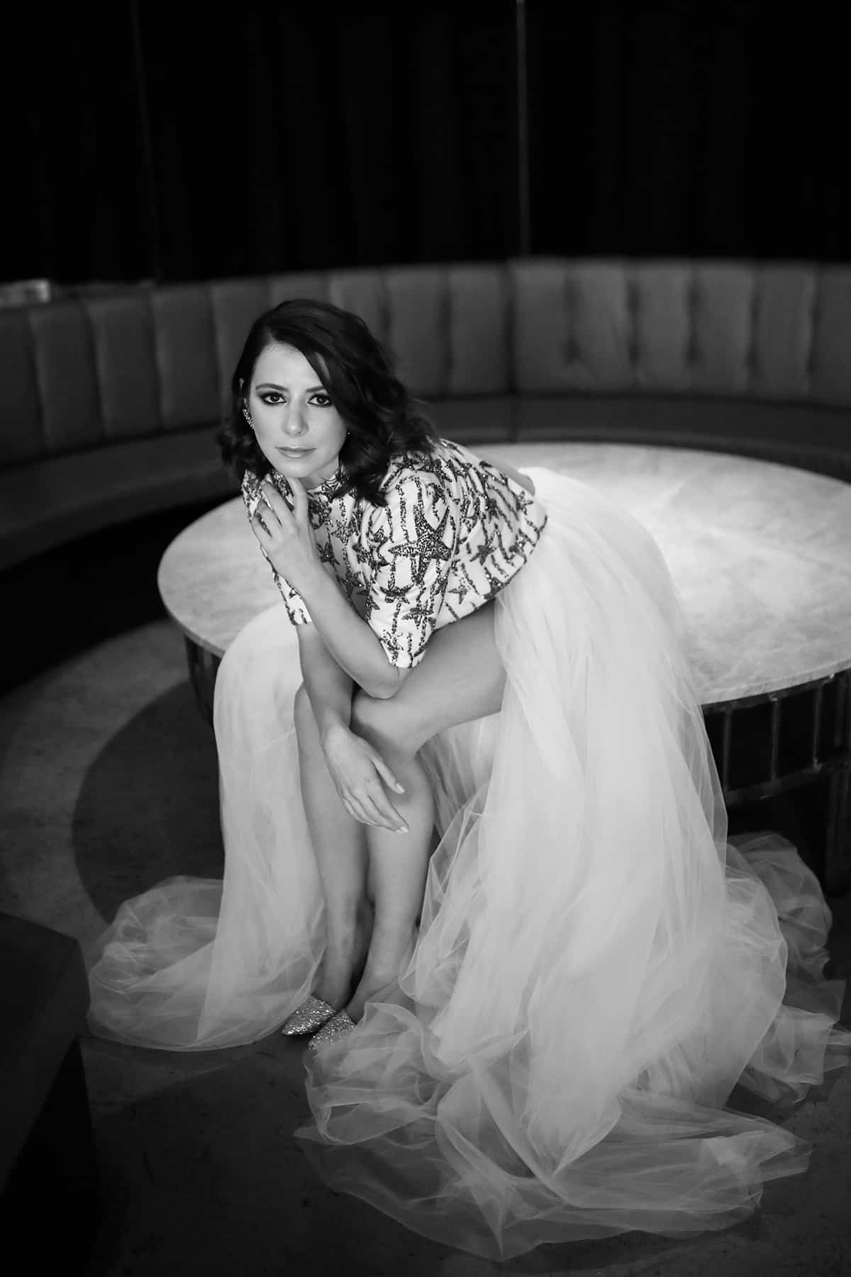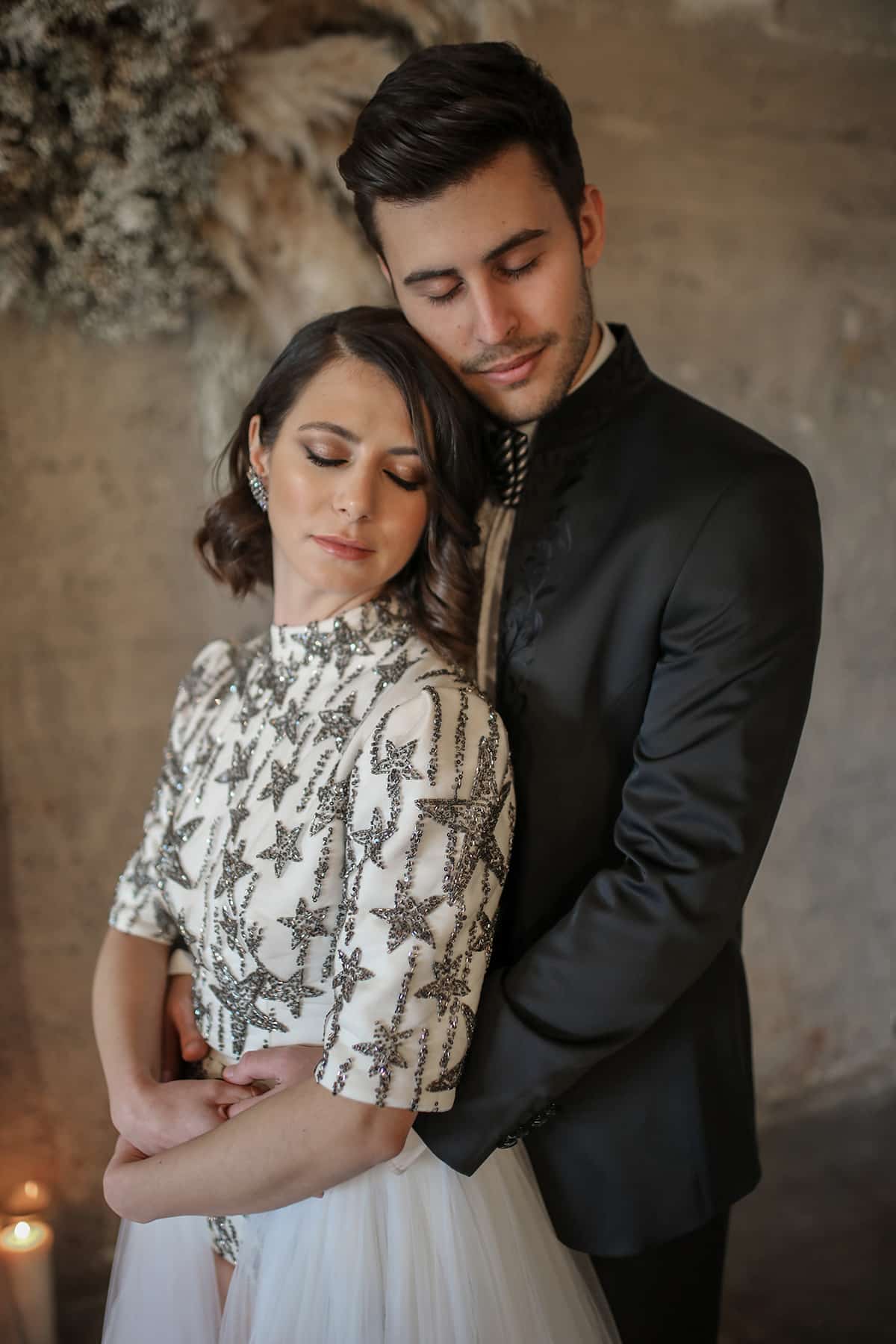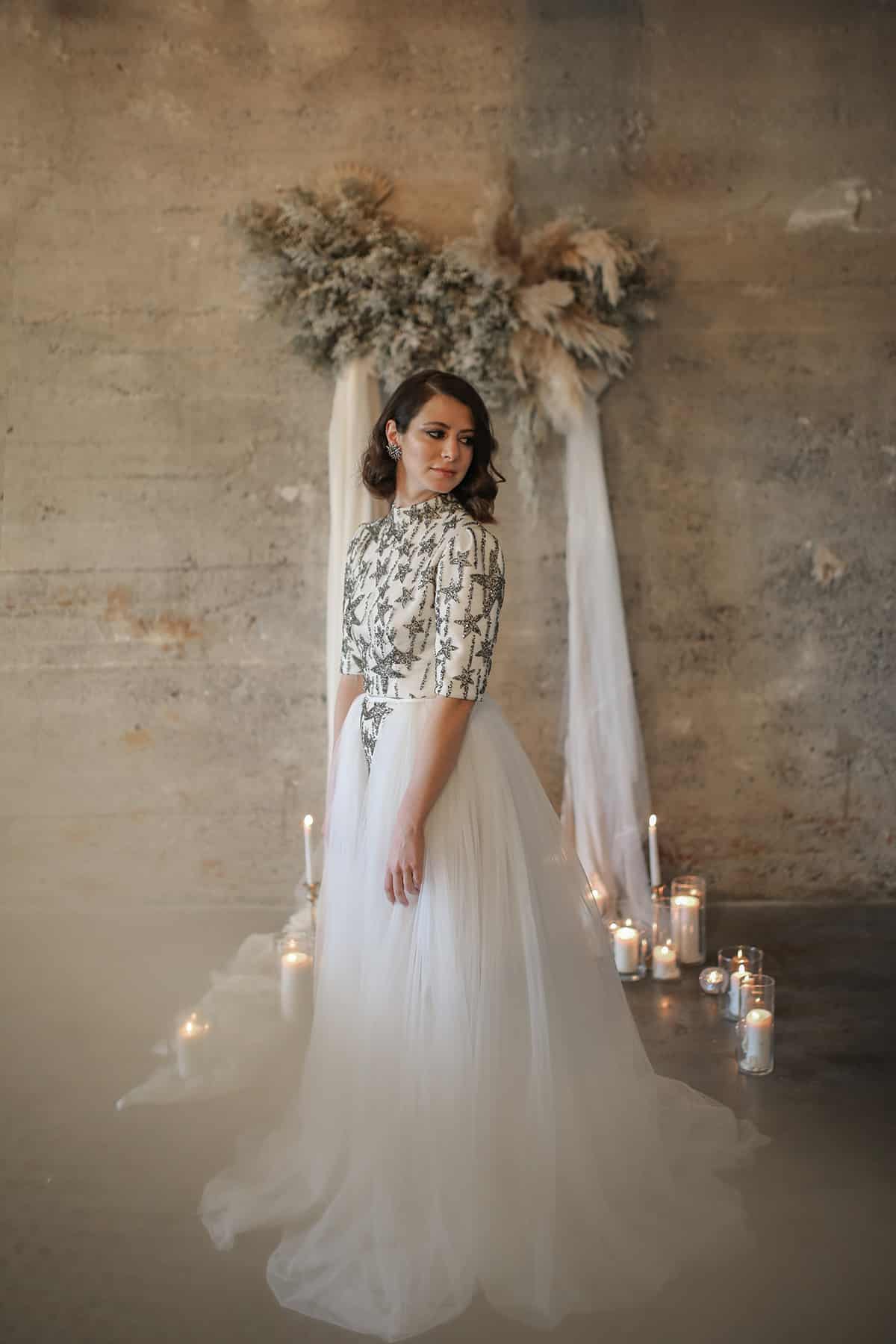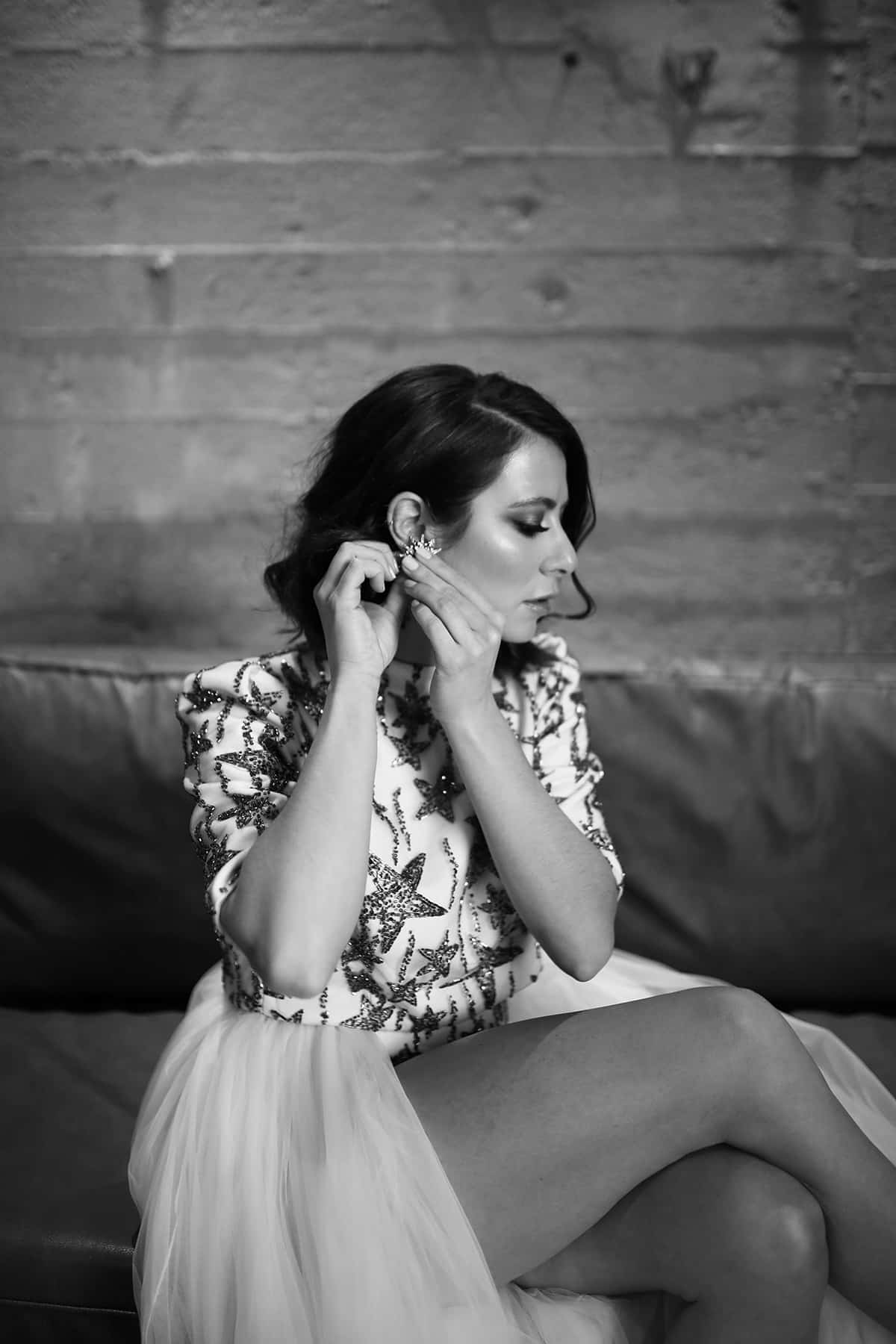 Una mujer cubierta de estrellas, alejada de los cánones de las novias convencionales, pero derrochando elegancia y estilo, una cola singular. Que la hace sensual y rompedora. Una mujer con la que soñar, un diseño espectacular de Alicia Rueda con zapatos de Calzados niza y pendientes en forma de estrella de la diseñadora Sigrid Sirvent de Bodas de tul.
