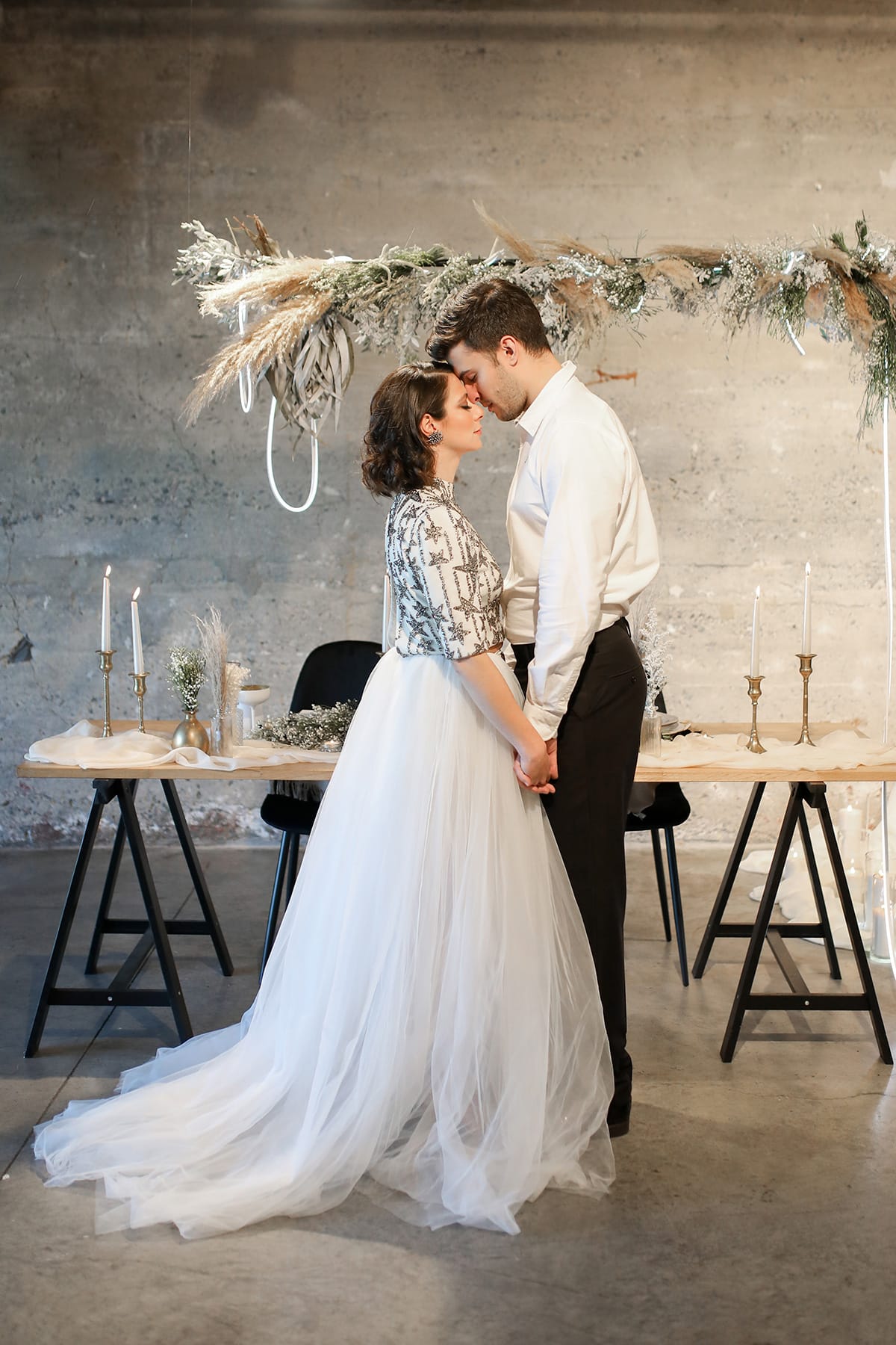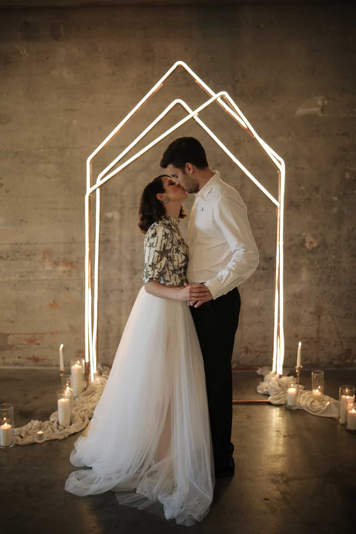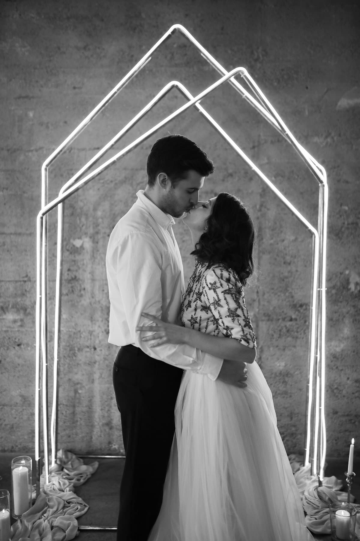 Para ello contamos con proveedores como Laida de Insidennova que se encargó de iluminar la sesión con una estructura asimétrica de neón en la parte de la fiesta y con un led colgante en la mesa presidencial. La papelería fue diseñada por Virginia de lajuliette y el material decorativo de AH Rentals hizo que pudiésemos transmitir lo que estábamos buscando.