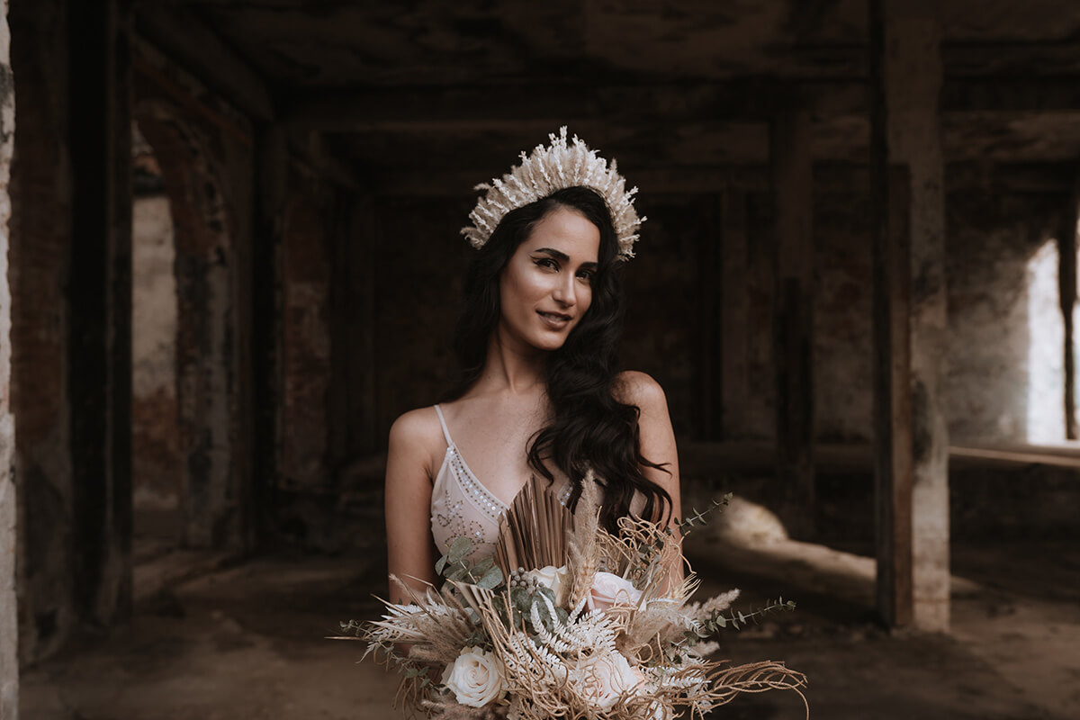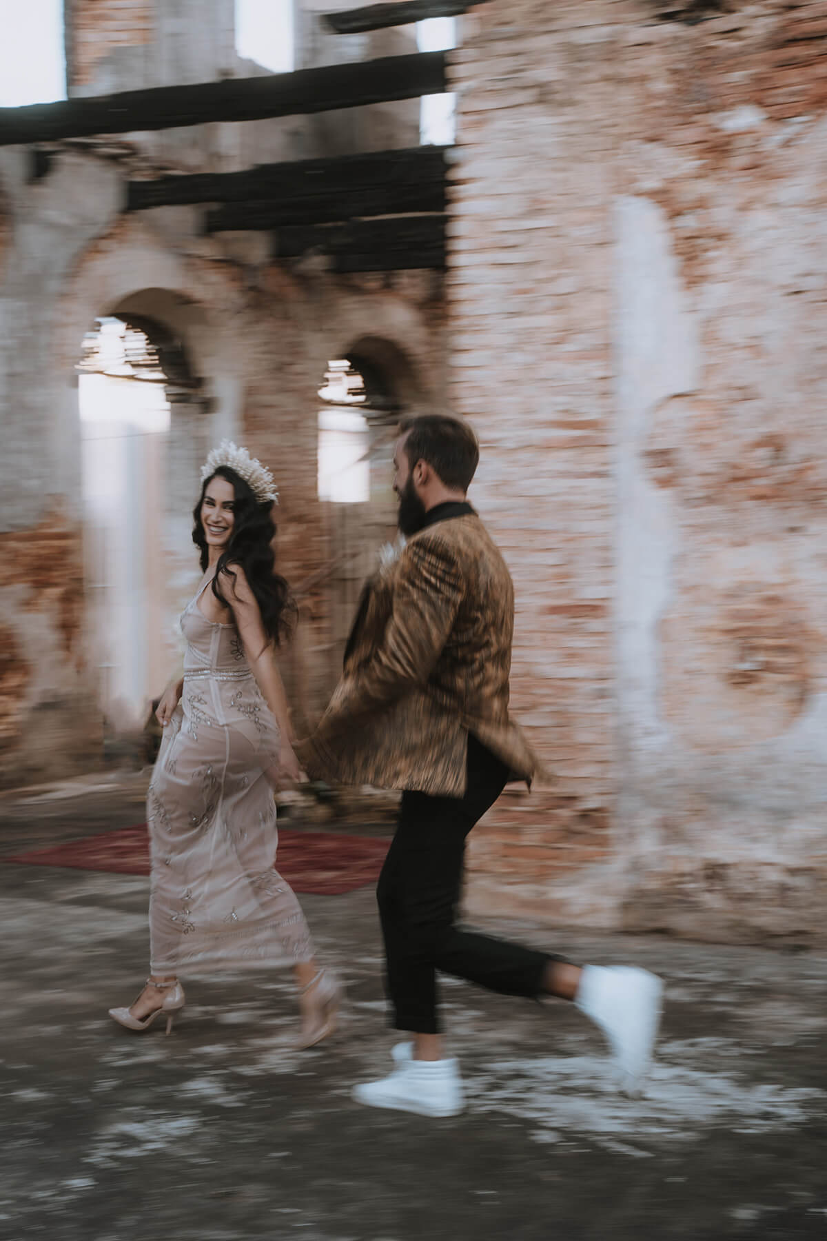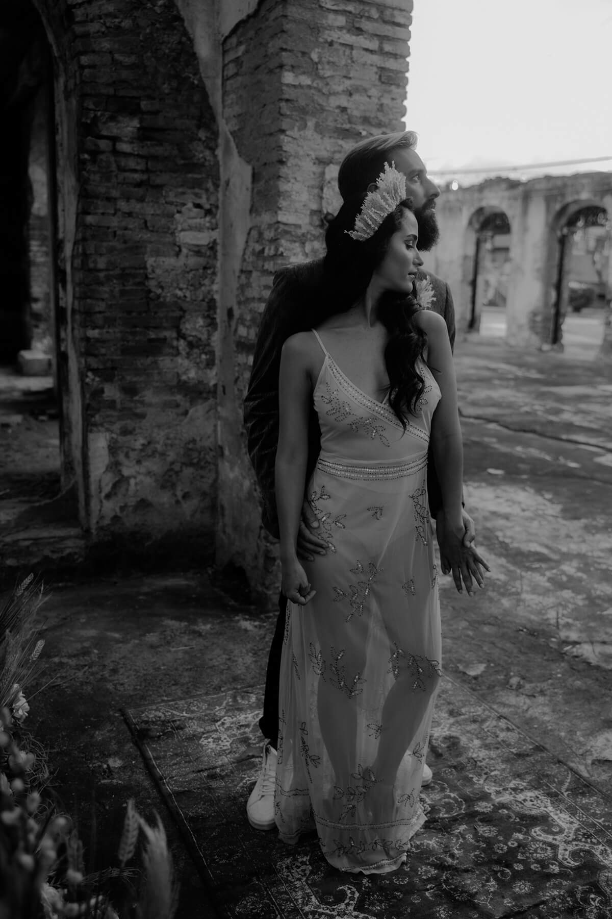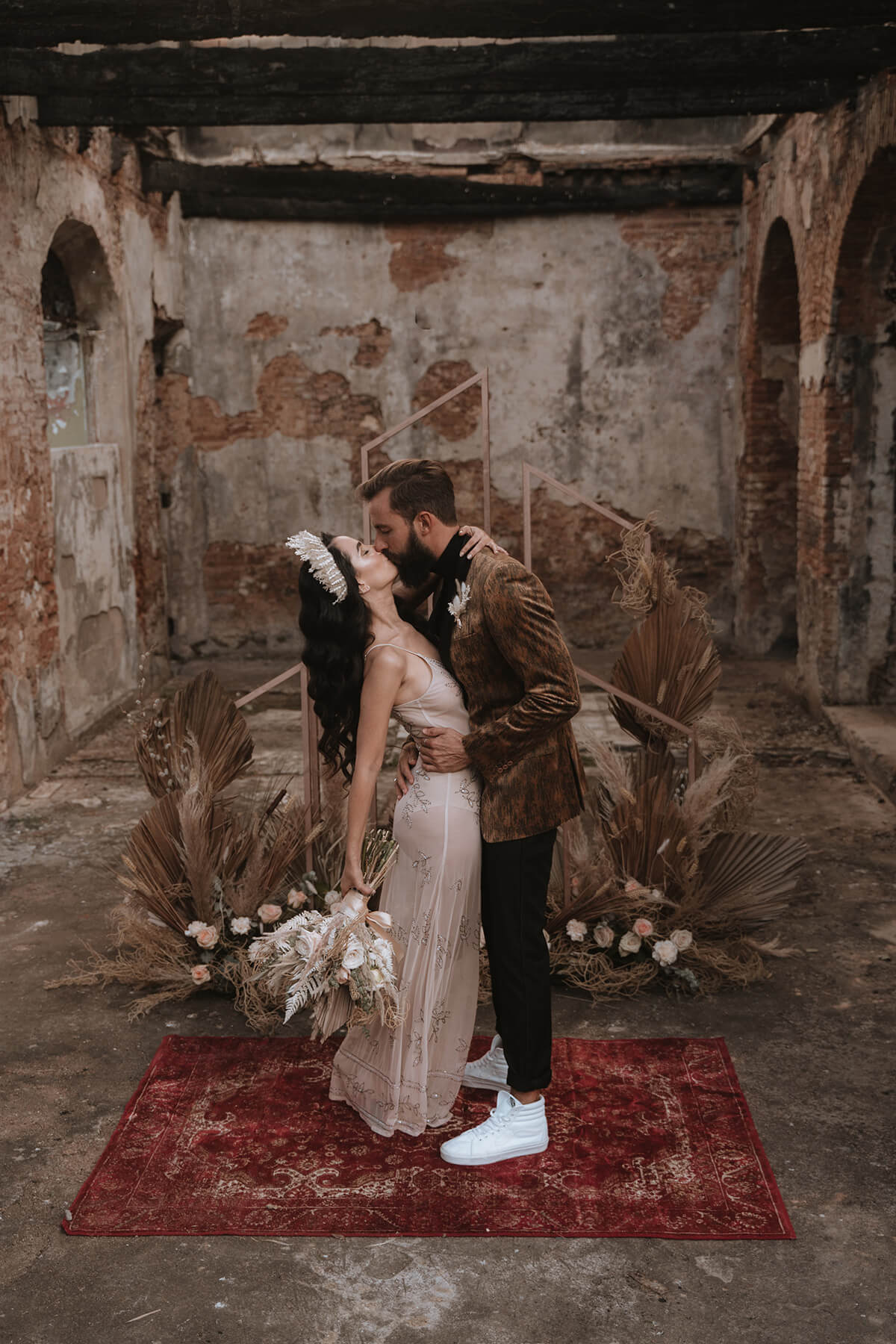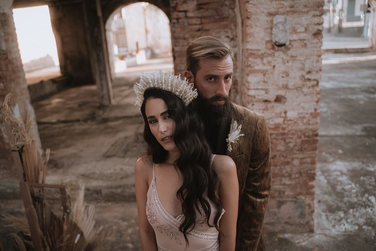 Texto @artonico.stories | “Te Imaginé» se inspiró en traer una mezcla de lo audaz con lo elegante y ecléctico. Esto se logra al incluir diferentes elementos que hacen de esta una combinación perfecta. El estilo de vestimenta poco convencional de la novia y el novio, en lugar del uso de los trajes de boda tradicionales. Además, los detalles del maquillaje de la novia y los colores poco convencionales del esmoquin y las zapatillas del novio. Además, las ruinas de un edificio abandonado que data de los años 1800 para traer una cierta mística al conjunto; sensación de concepto de fuga.