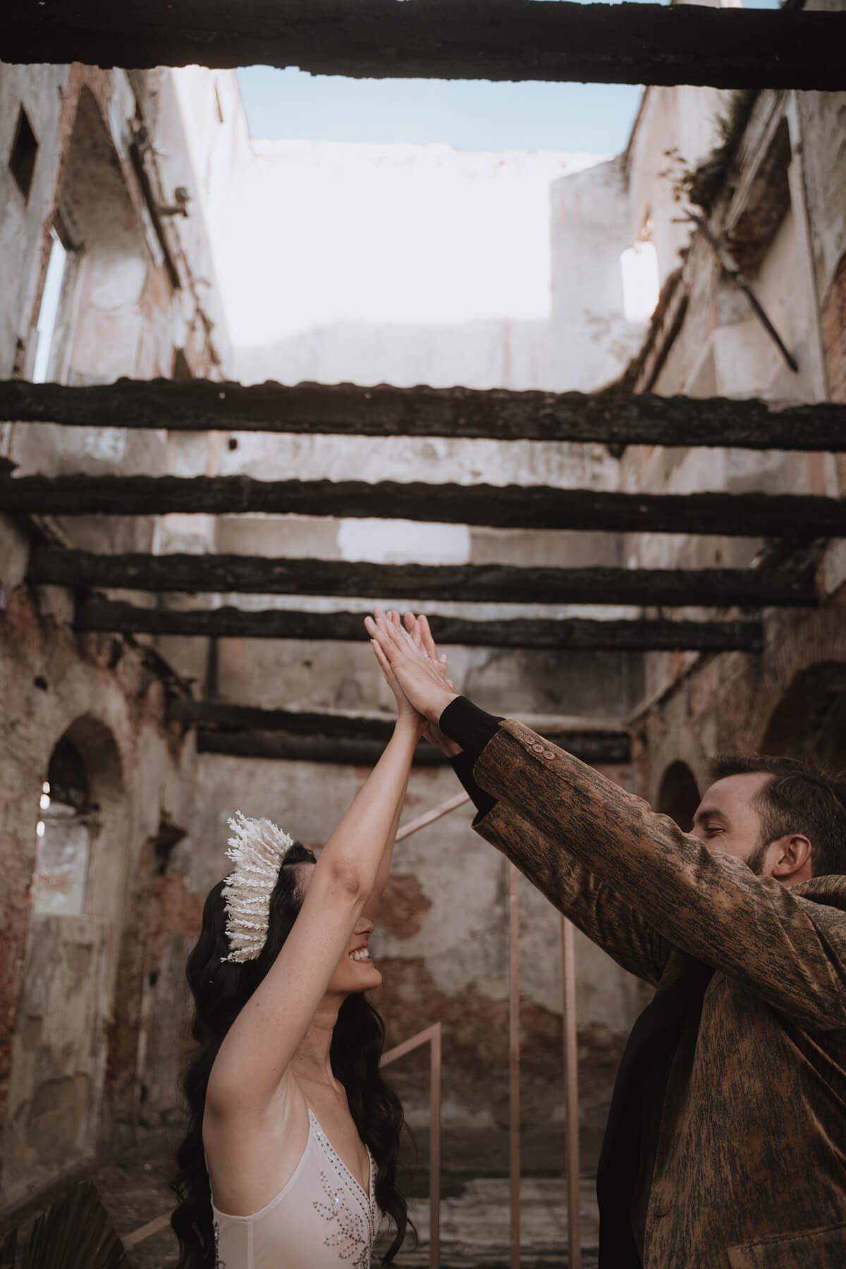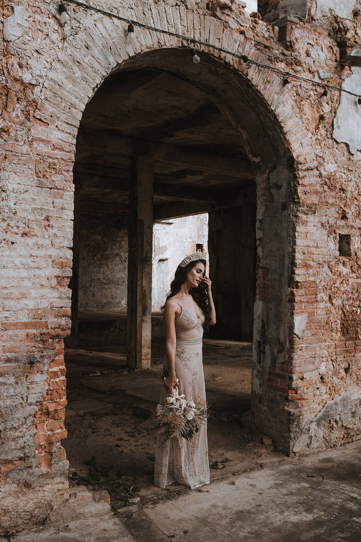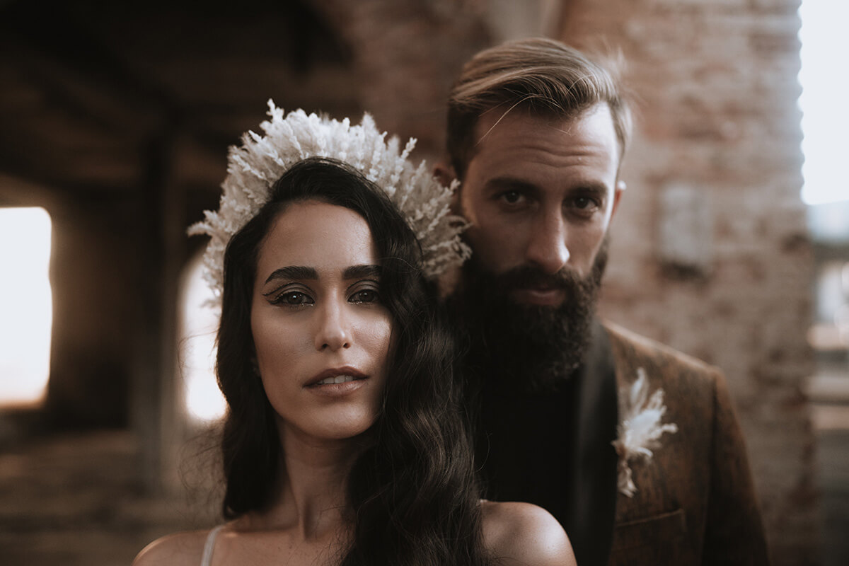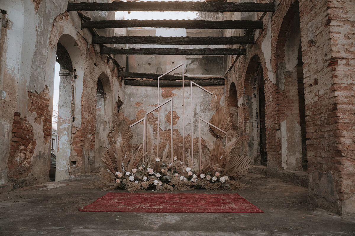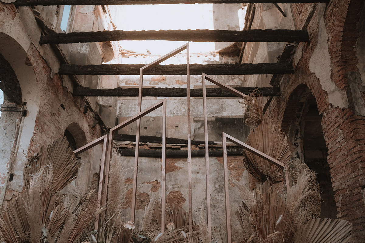 Texto @artonico.stories | “Te Imaginé» se inspiró en traer una mezcla de lo audaz con lo elegante y ecléctico. Esto se logra al incluir diferentes elementos que hacen de esta una combinación perfecta. El estilo de vestimenta poco convencional de la novia y el novio, en lugar del uso de los trajes de boda tradicionales. Además, los detalles del maquillaje de la novia y los colores poco convencionales del esmoquin y las zapatillas del novio. Además, las ruinas de un edificio abandonado que data de los años 1800 para traer una cierta mística al conjunto; sensación de concepto de fuga.
