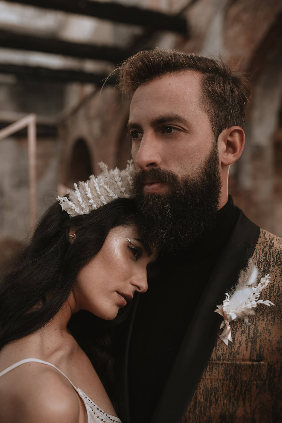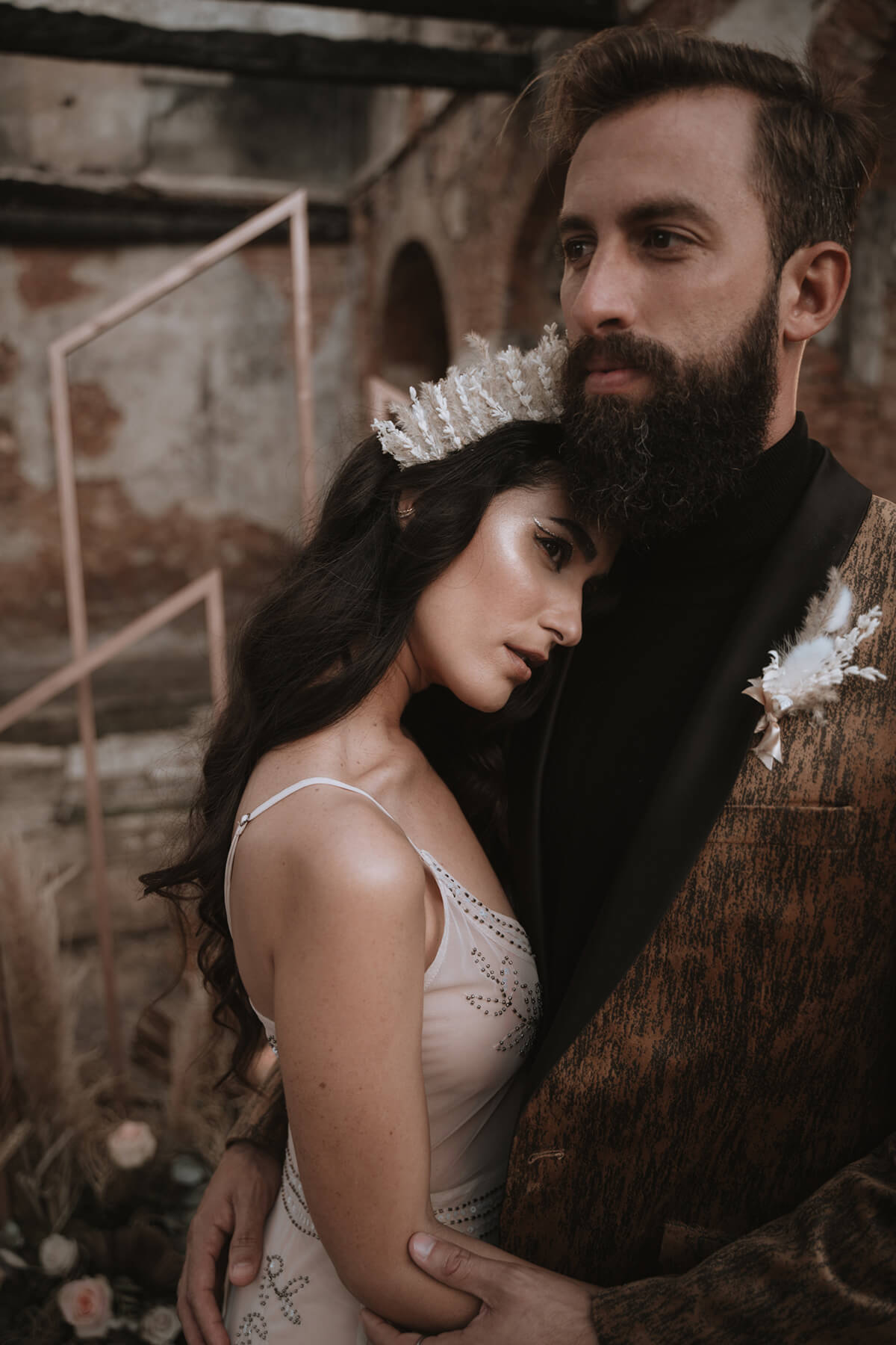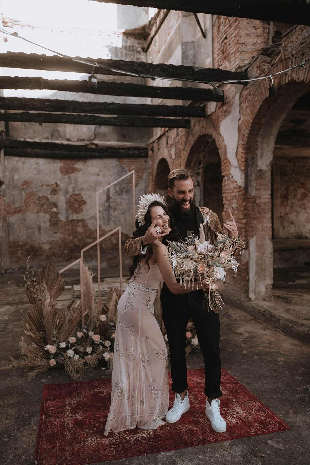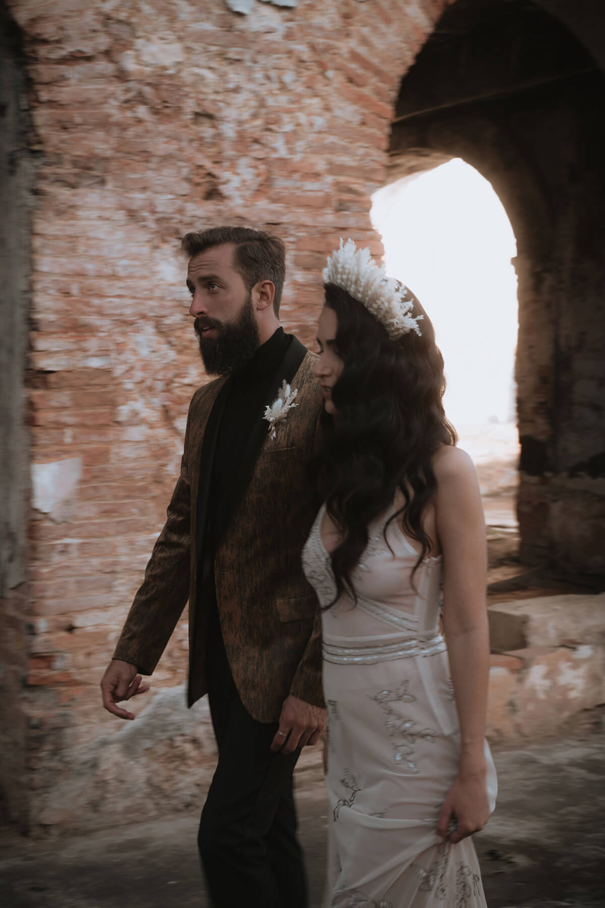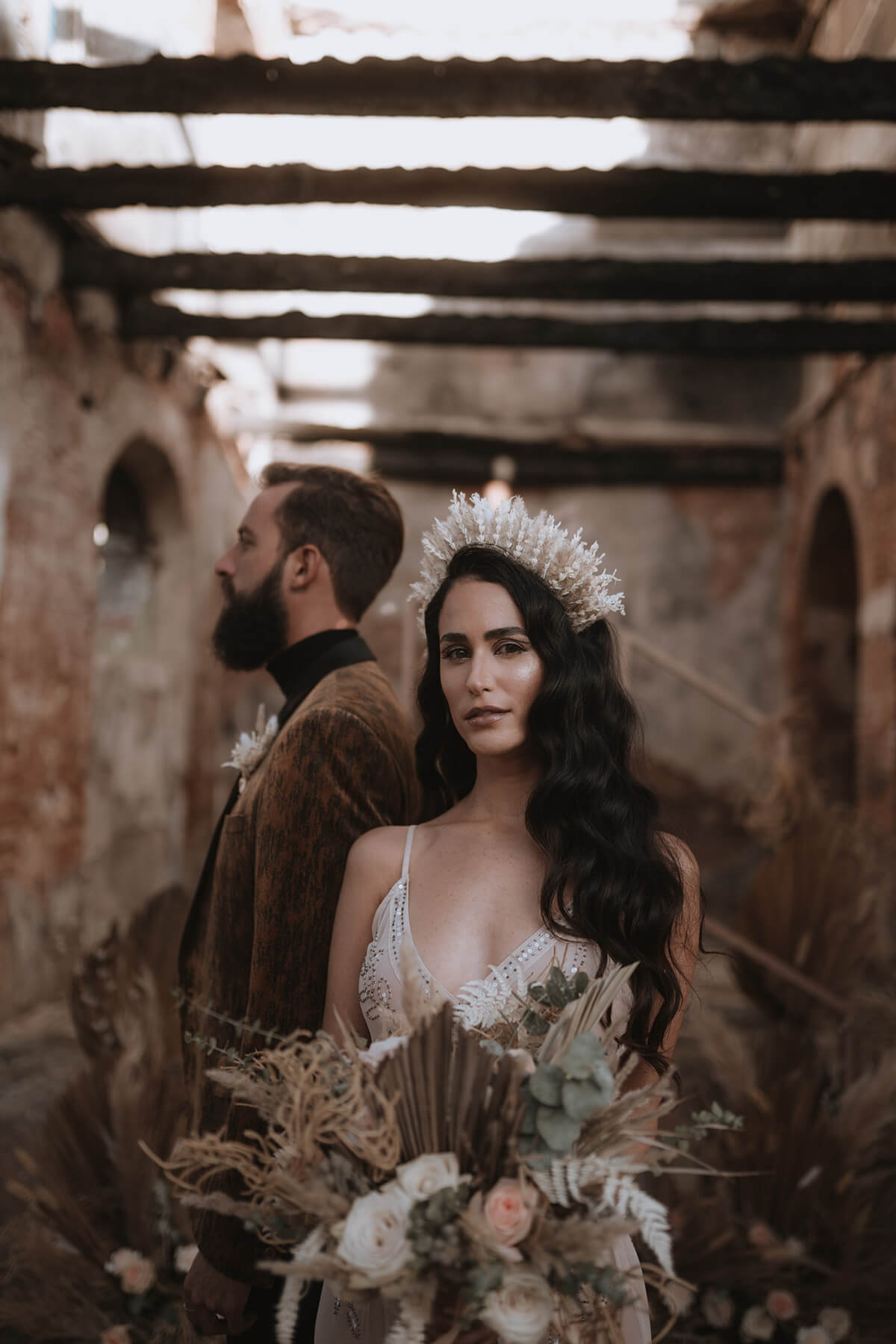 Texto @artonico.stories | “Te Imaginé» se inspiró en traer una mezcla de lo audaz con lo elegante y ecléctico. Esto se logra al incluir diferentes elementos que hacen de esta una combinación perfecta. El estilo de vestimenta poco convencional de la novia y el novio, en lugar del uso de los trajes de boda tradicionales. Además, los detalles del maquillaje de la novia y los colores poco convencionales del esmoquin y las zapatillas del novio. Además, las ruinas de un edificio abandonado que data de los años 1800 para traer una cierta mística al conjunto; sensación de concepto de fuga.