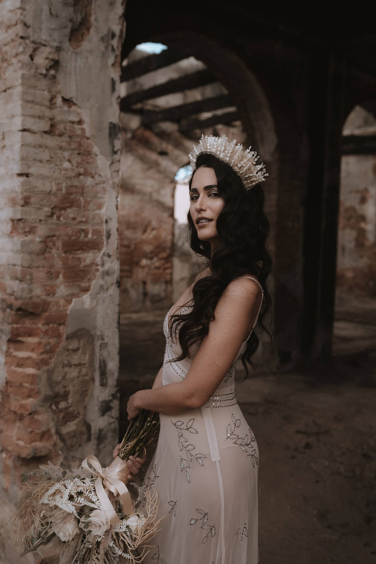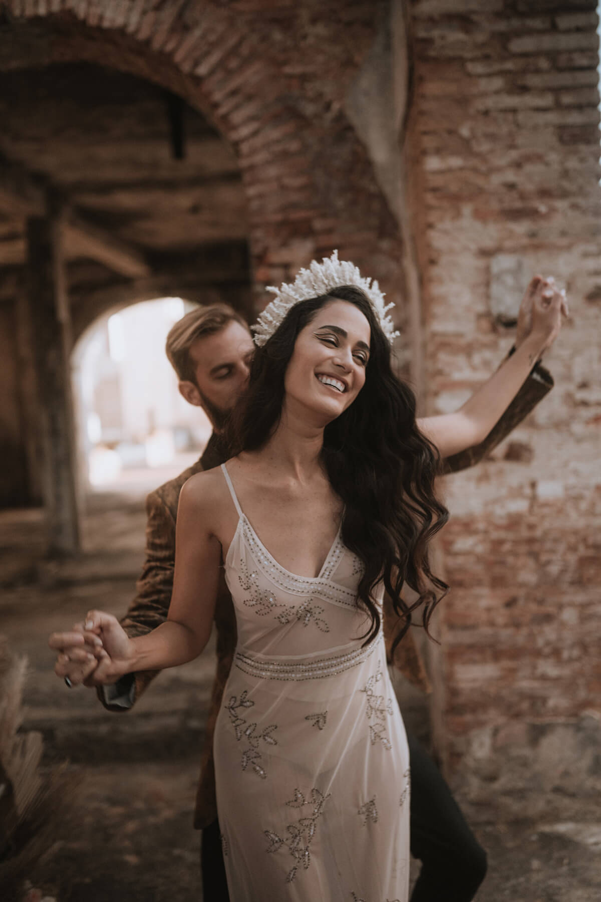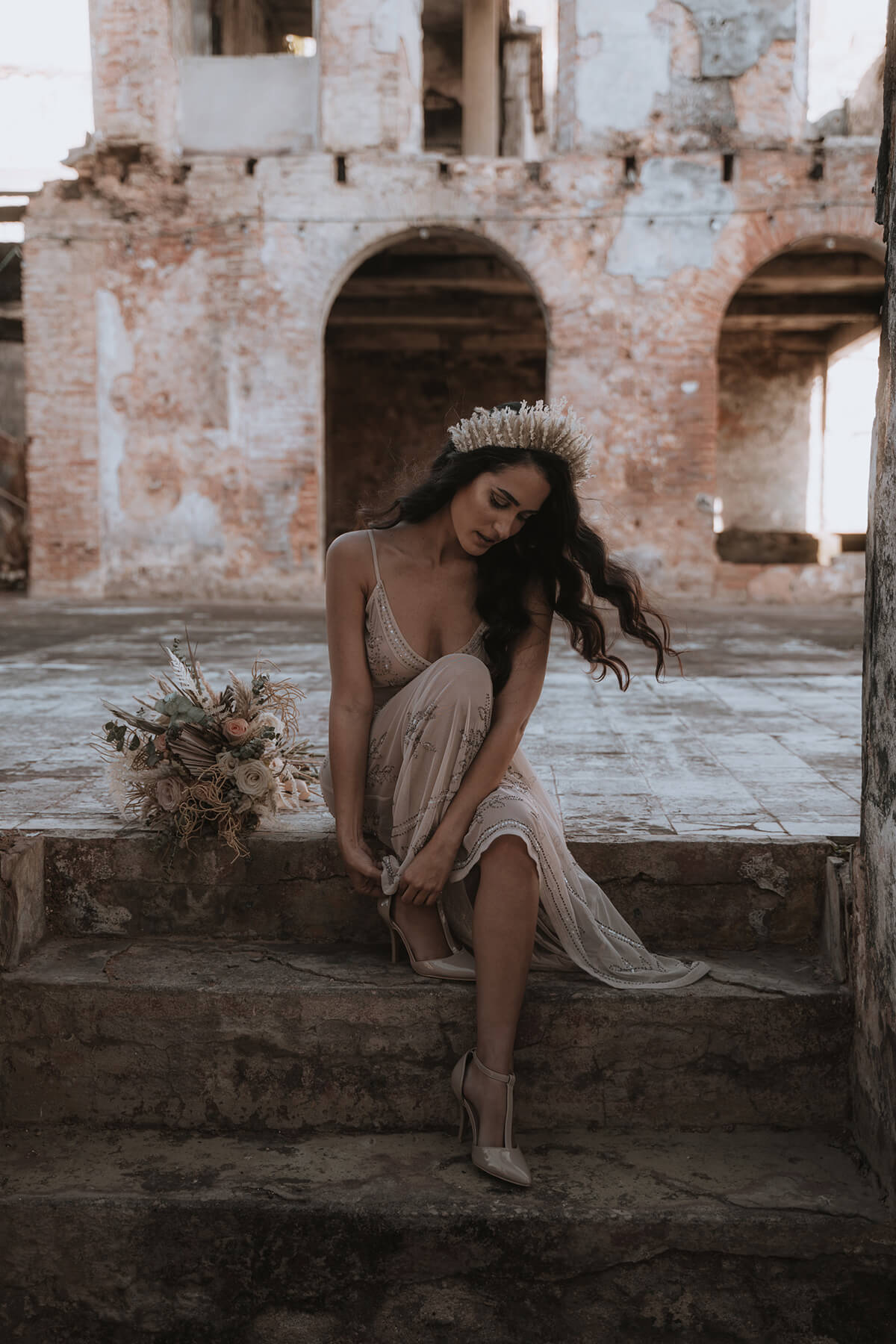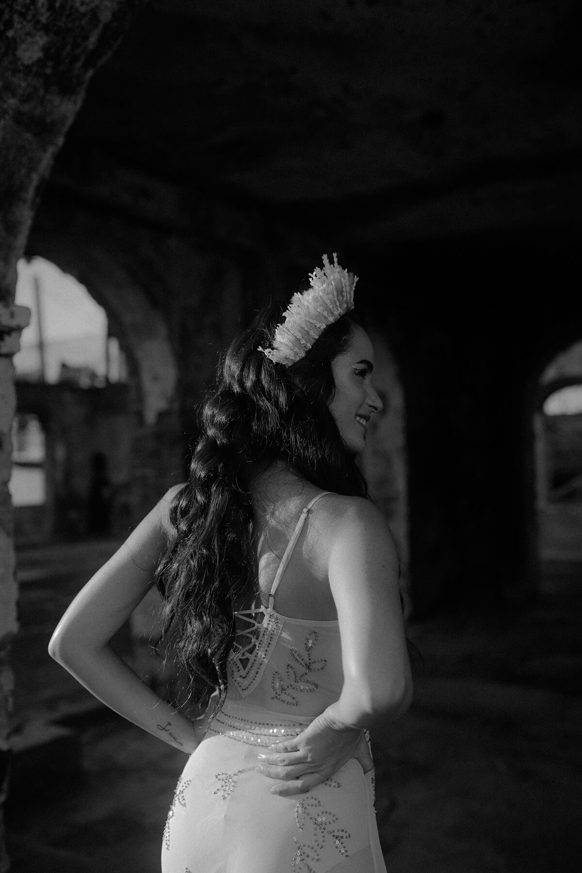 Texto @artonico.stories | “Te Imaginé» se inspiró en traer una mezcla de lo audaz con lo elegante y ecléctico. Esto se logra al incluir diferentes elementos que hacen de esta una combinación perfecta. El estilo de vestimenta poco convencional de la novia y el novio, en lugar del uso de los trajes de boda tradicionales. Además, los detalles del maquillaje de la novia y los colores poco convencionales del esmoquin y las zapatillas del novio. Además, las ruinas de un edificio abandonado que data de los años 1800 para traer una cierta mística al conjunto; sensación de concepto de fuga.