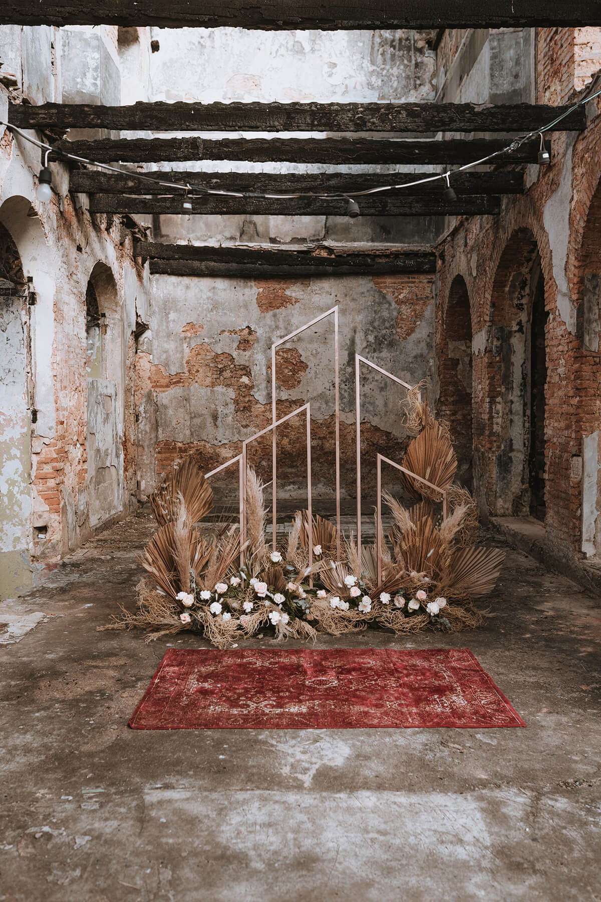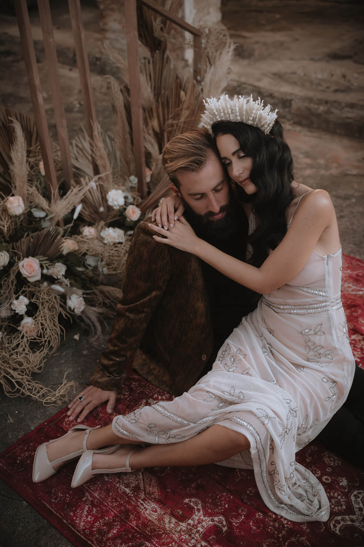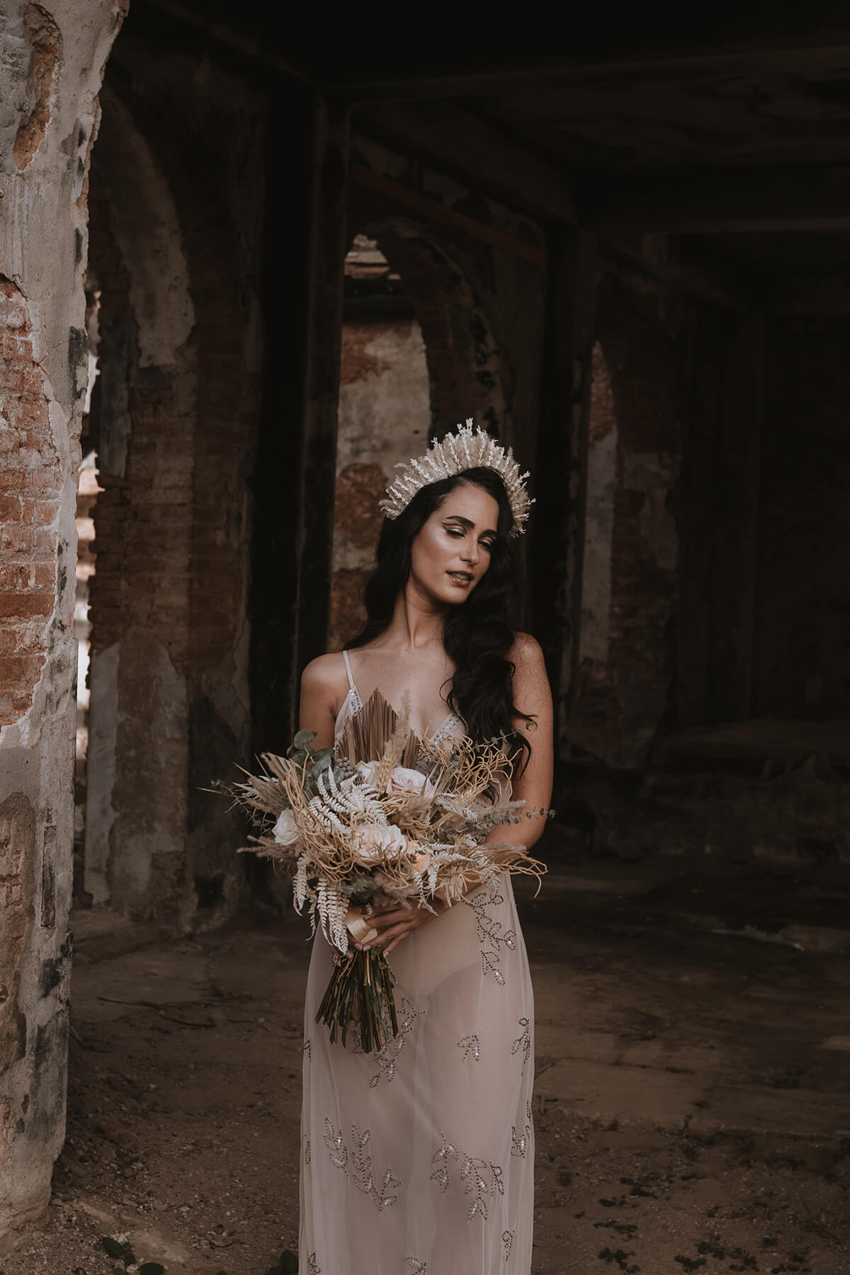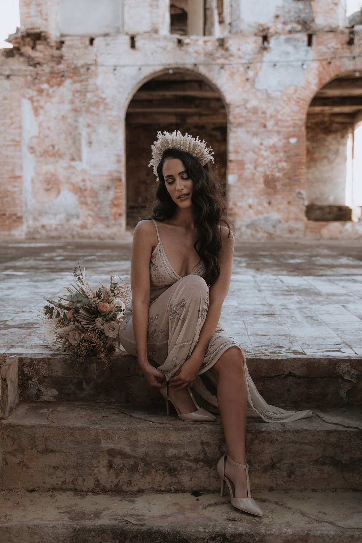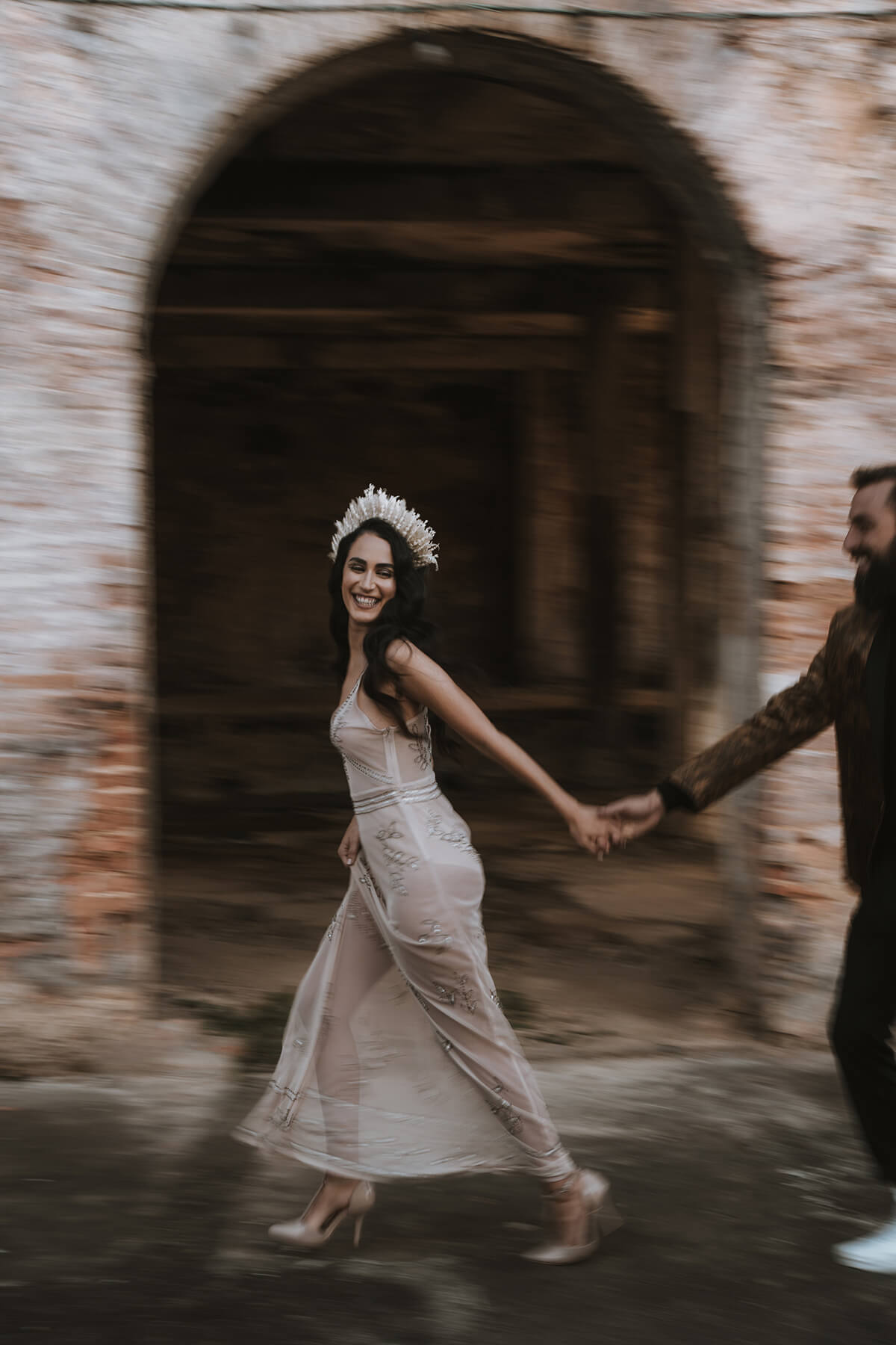 Texto @artonico.stories | “Te Imaginé» se inspiró en traer una mezcla de lo audaz con lo elegante y ecléctico. Esto se logra al incluir diferentes elementos que hacen de esta una combinación perfecta. El estilo de vestimenta poco convencional de la novia y el novio, en lugar del uso de los trajes de boda tradicionales. Además, los detalles del maquillaje de la novia y los colores poco convencionales del esmoquin y las zapatillas del novio. Además, las ruinas de un edificio abandonado que data de los años 1800 para traer una cierta mística al conjunto; sensación de concepto de fuga.