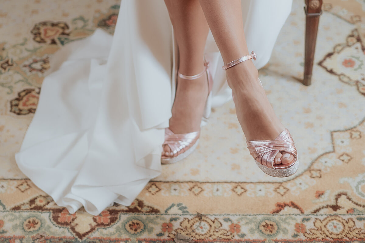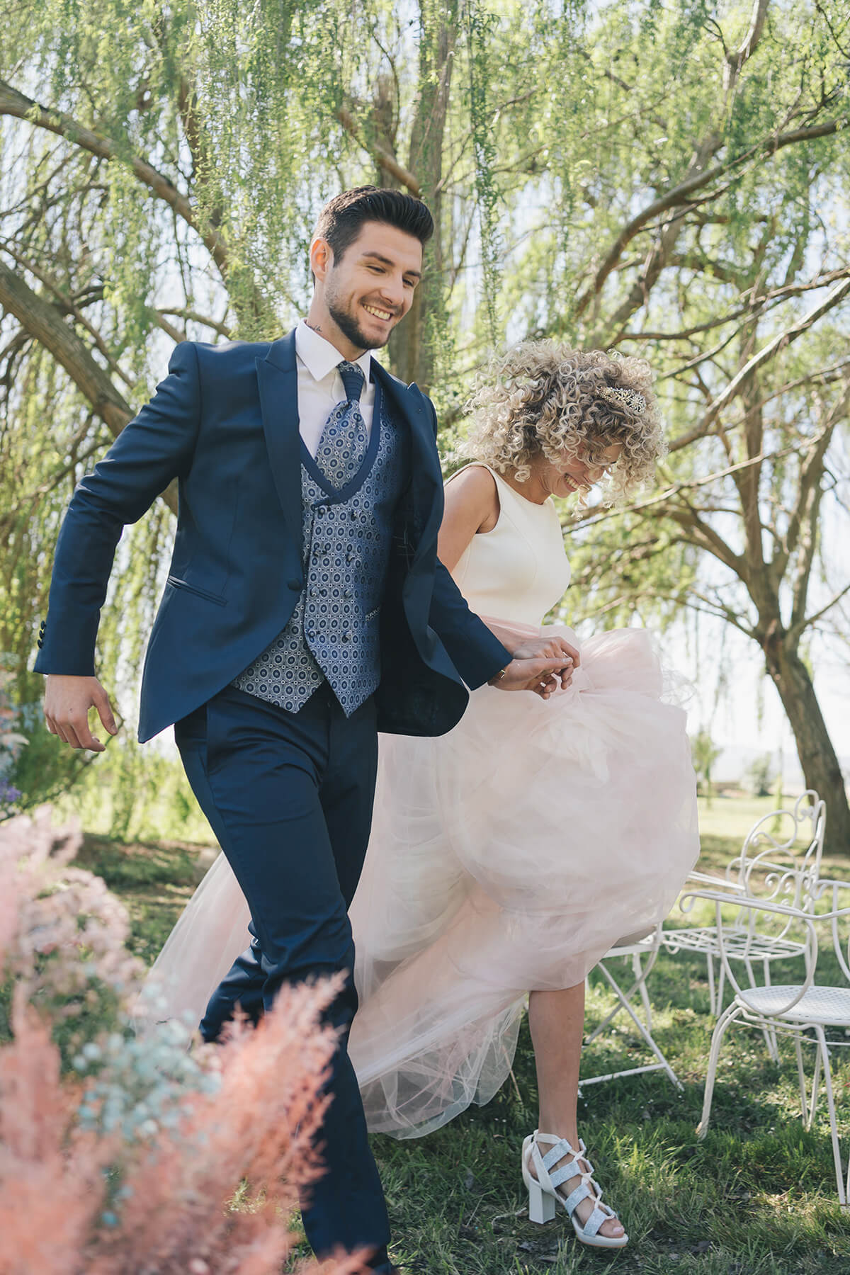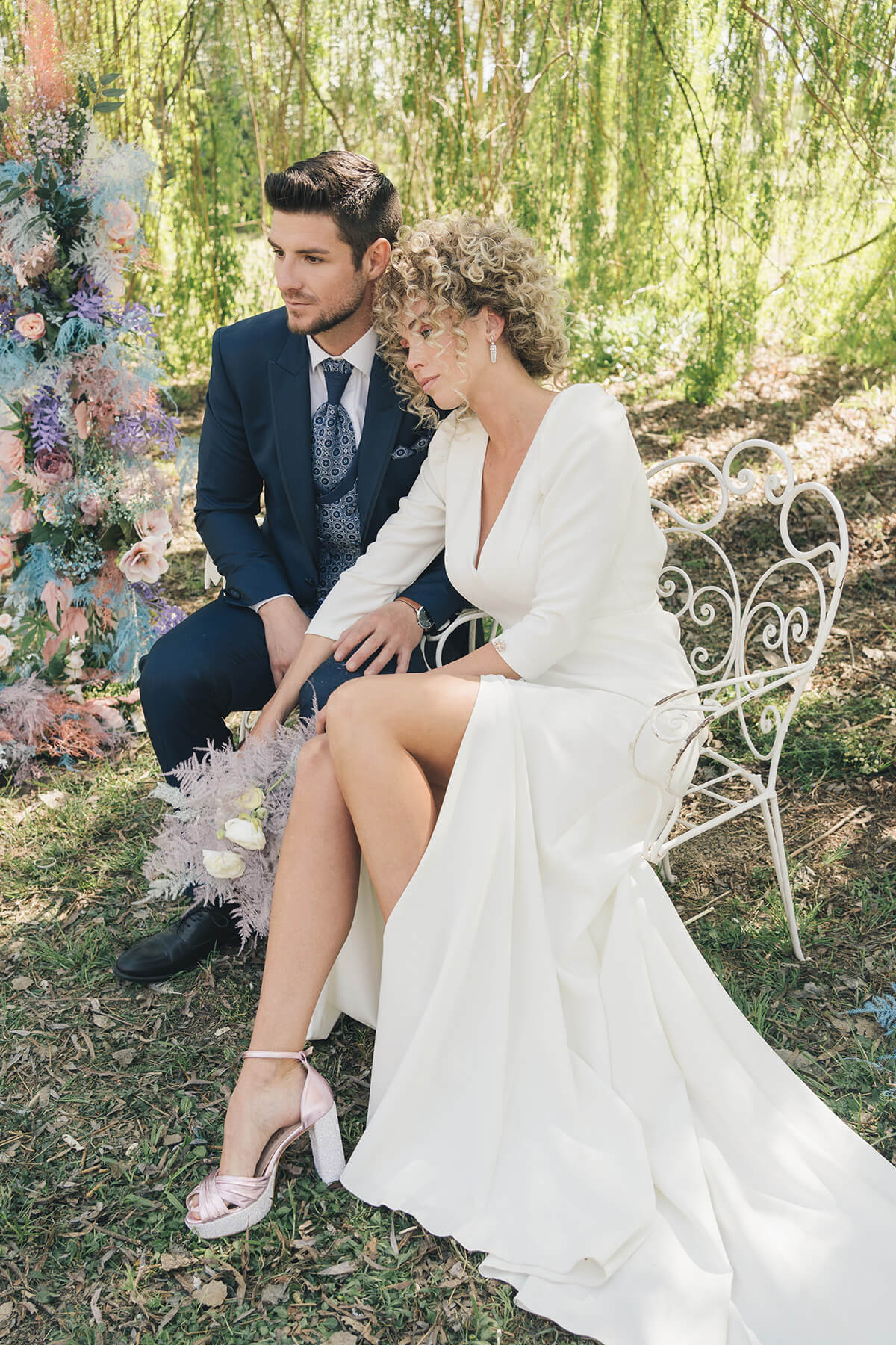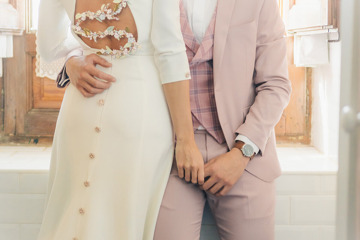 La diseñadora Silvia Fernández fue la encargada de vestir a la novia con dos looks totalmente diferentes, pero los dos con un mismo espíritu de feminidad y libertad. Cardiff Moda Hombre, especialistas en moda nupcial masculina, fue quien vistió al novio, también con dos looks acordes a los dos escenarios distintos. Los preciosos zapatos fueron cedidos por Calzados Austria.