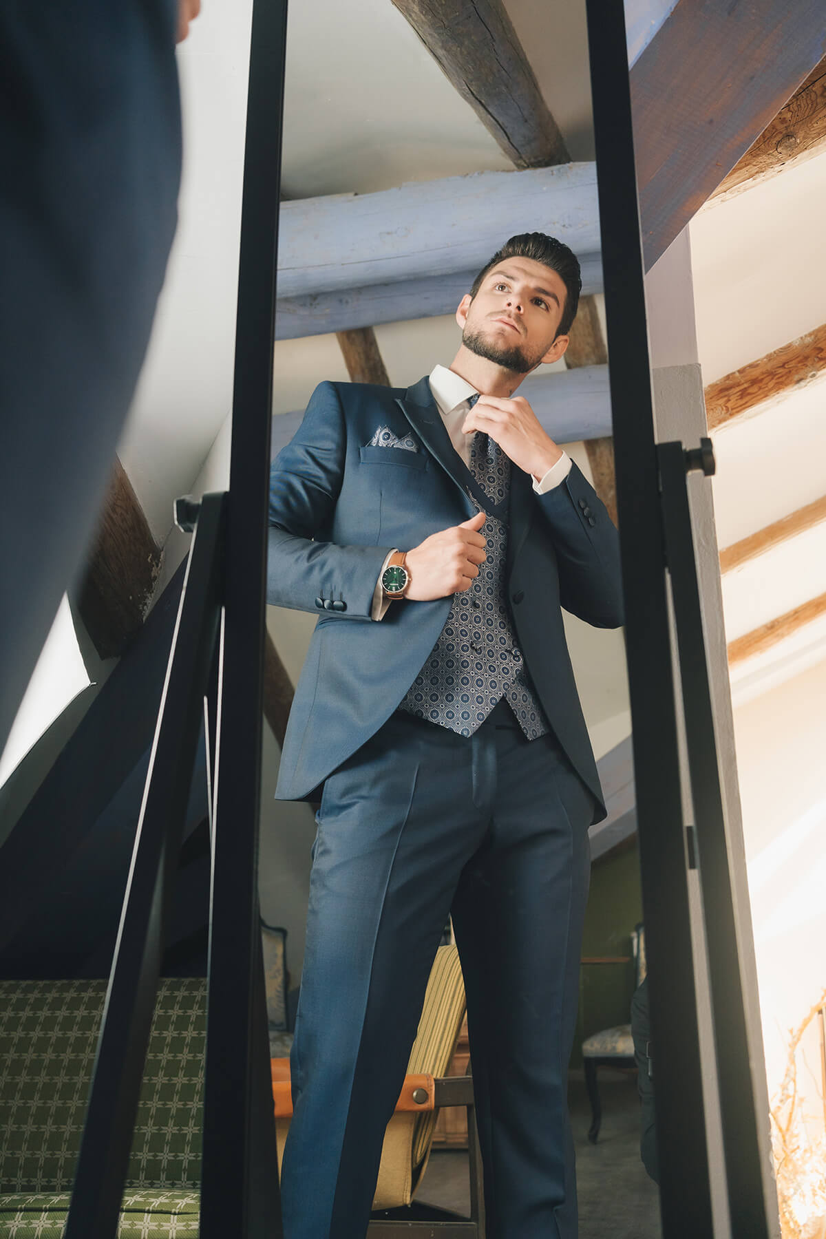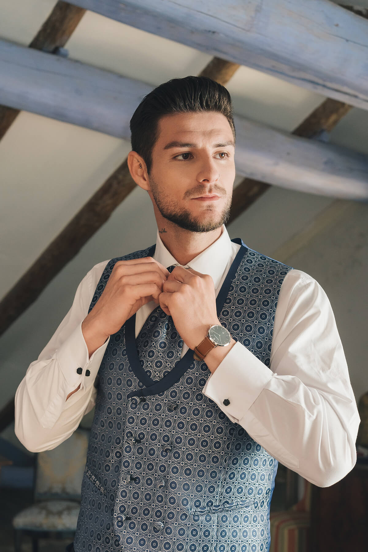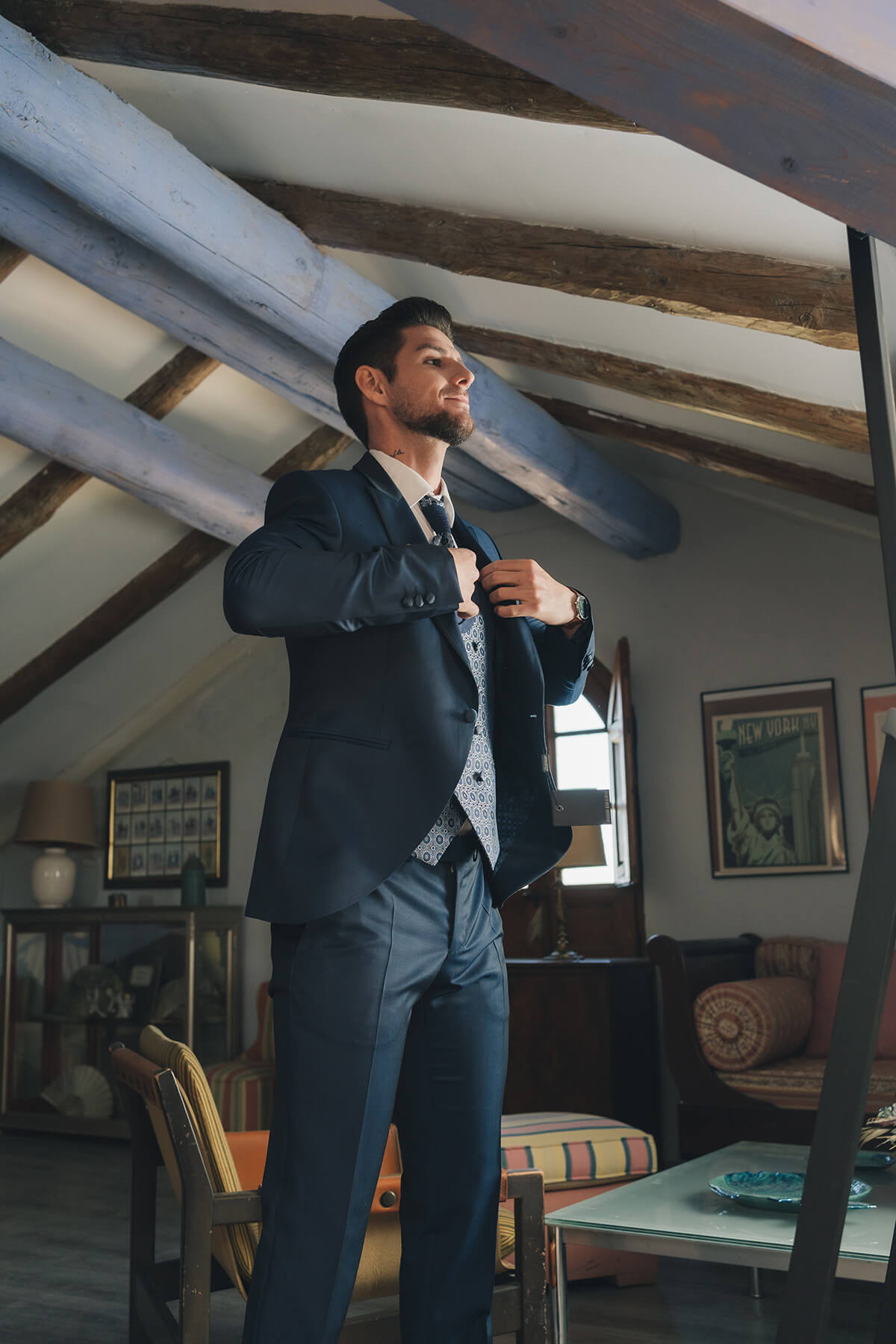 La diseñadora Silvia Fernández fue la encargada de vestir a la novia con dos looks totalmente diferentes, pero los dos con un mismo espíritu de feminidad y libertad. Cardiff Moda Hombre, especialistas en moda nupcial masculina, fue quien vistió al novio, también con dos looks acordes a los dos escenarios distintos. Los preciosos zapatos fueron cedidos por Calzados Austria.
